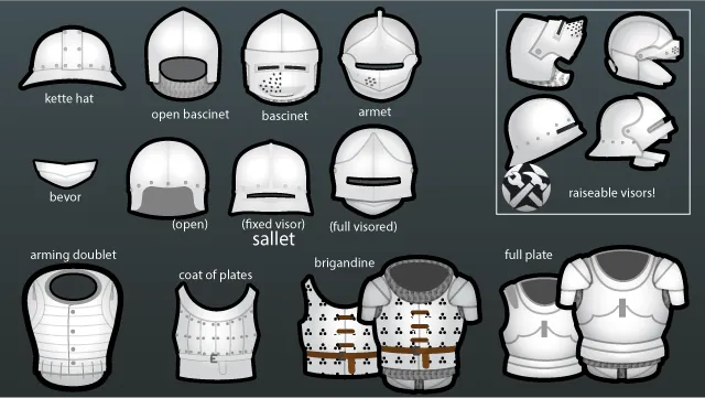 * [b]open bascinet[/b] - a sturdy plate helmet without a faceplate. Popular among archers for being ergonomic, but has lesser coverage.