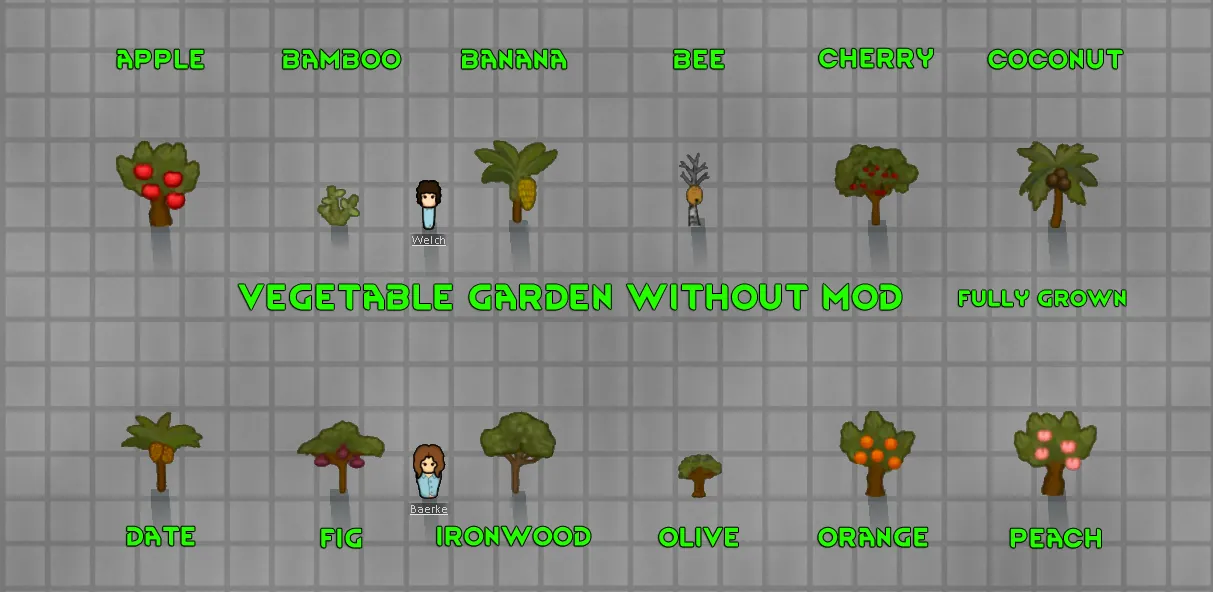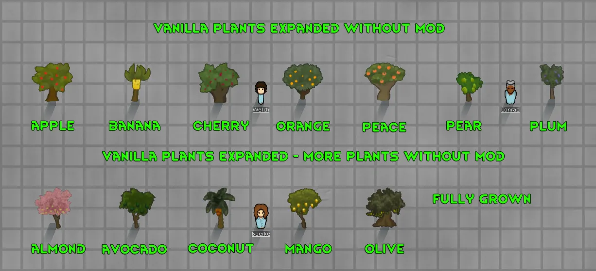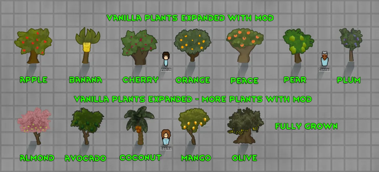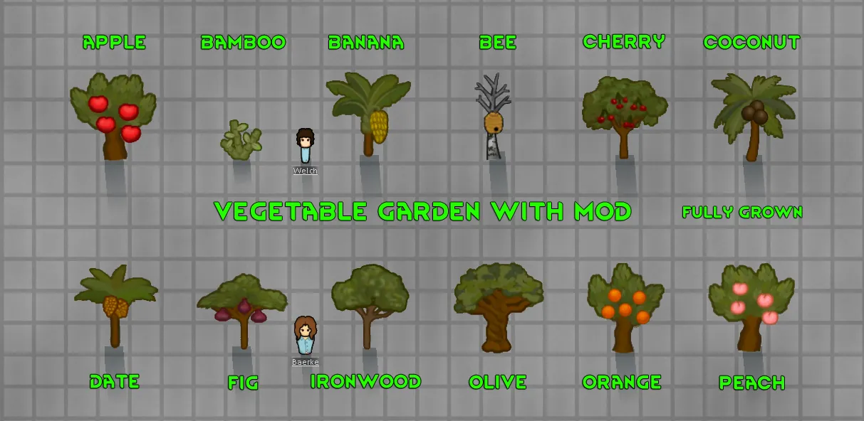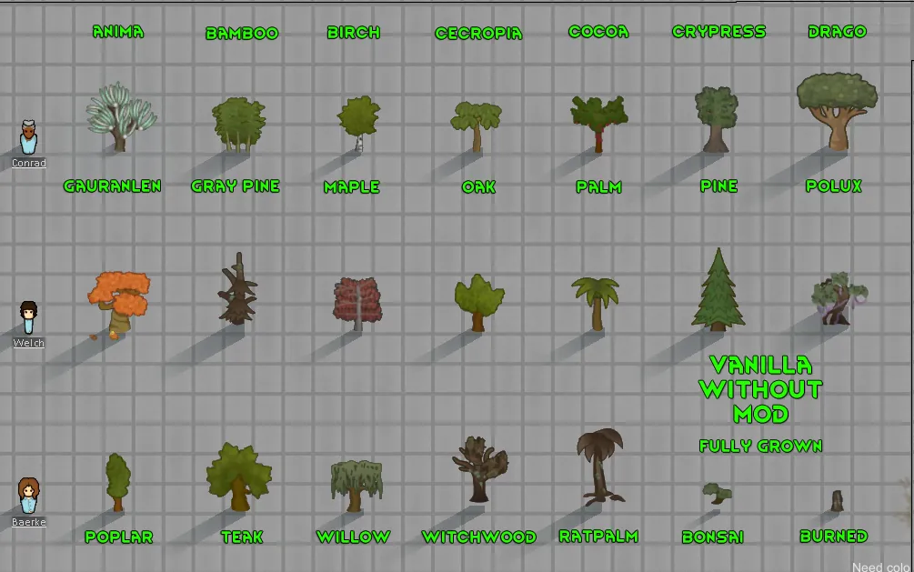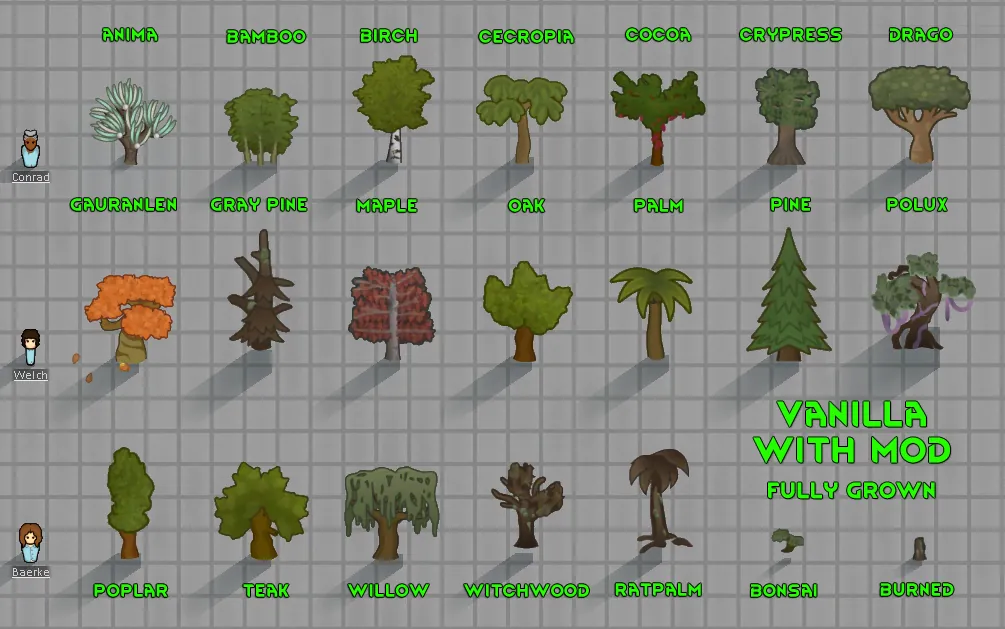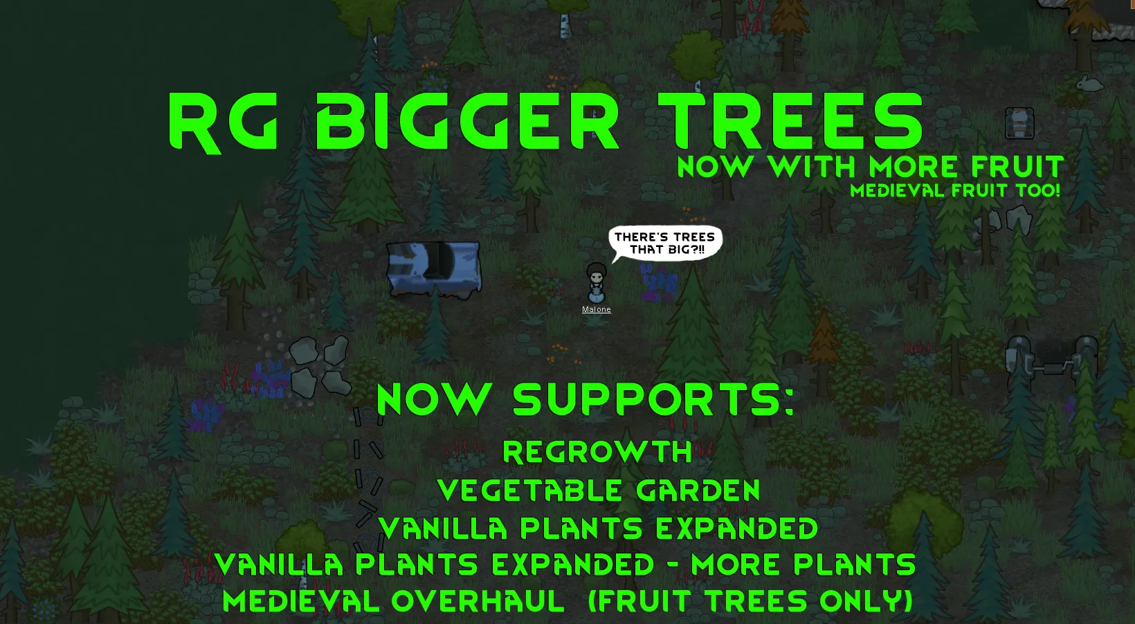 Changes tree sizes to be larger. Pawns, items and buildings will be hidden behind them. If you can't see then cut it down. Never liked that a pawn is out of scale with the trees. This helps a little.