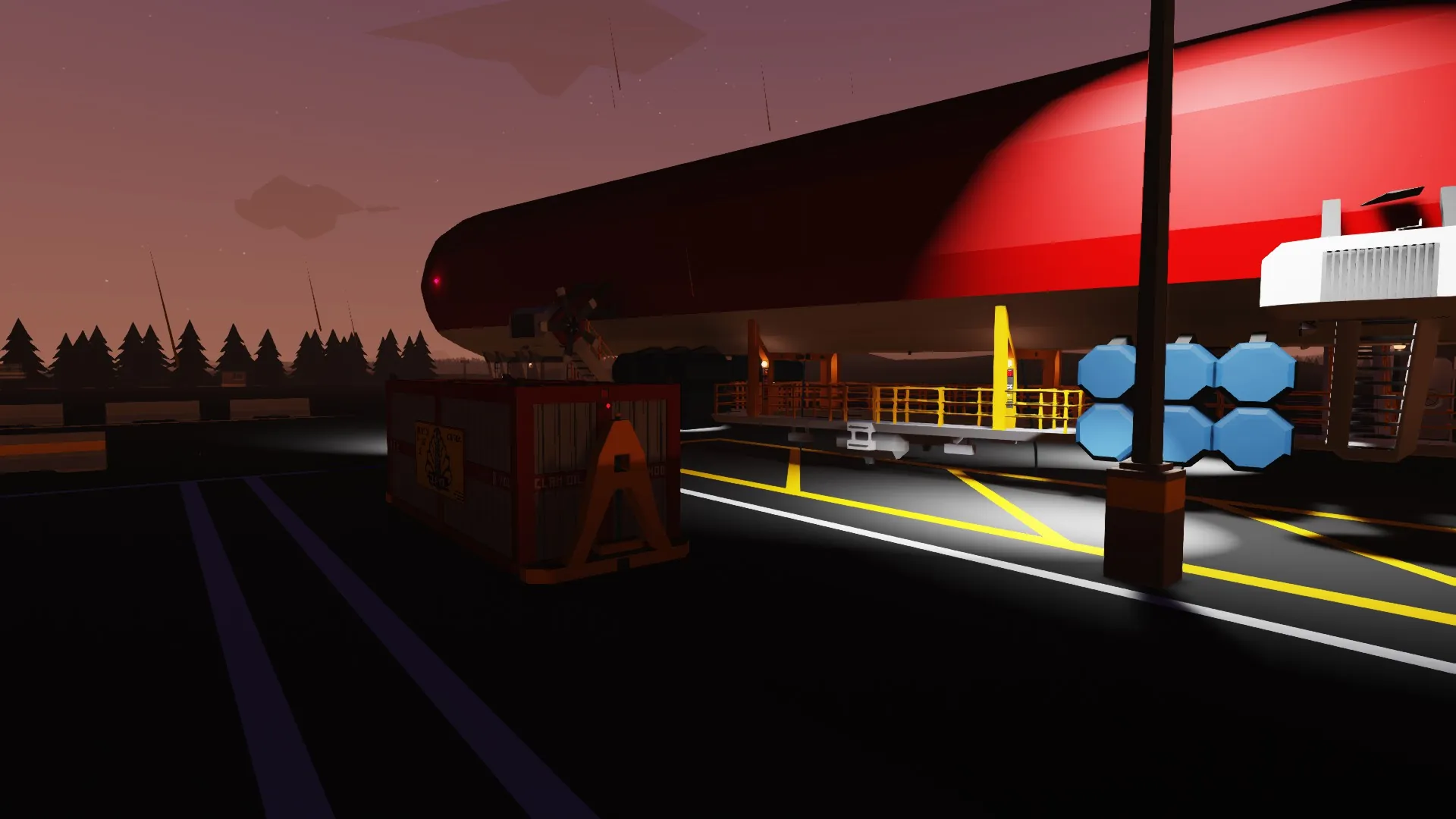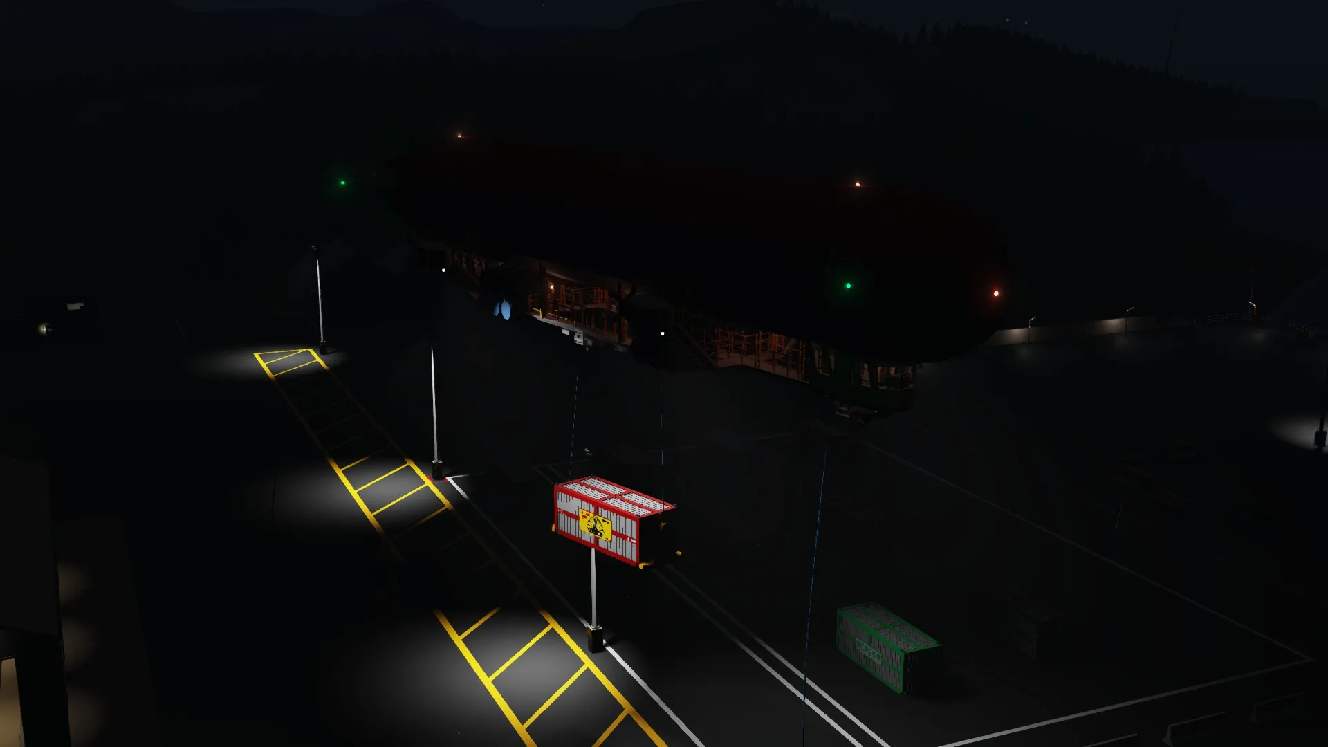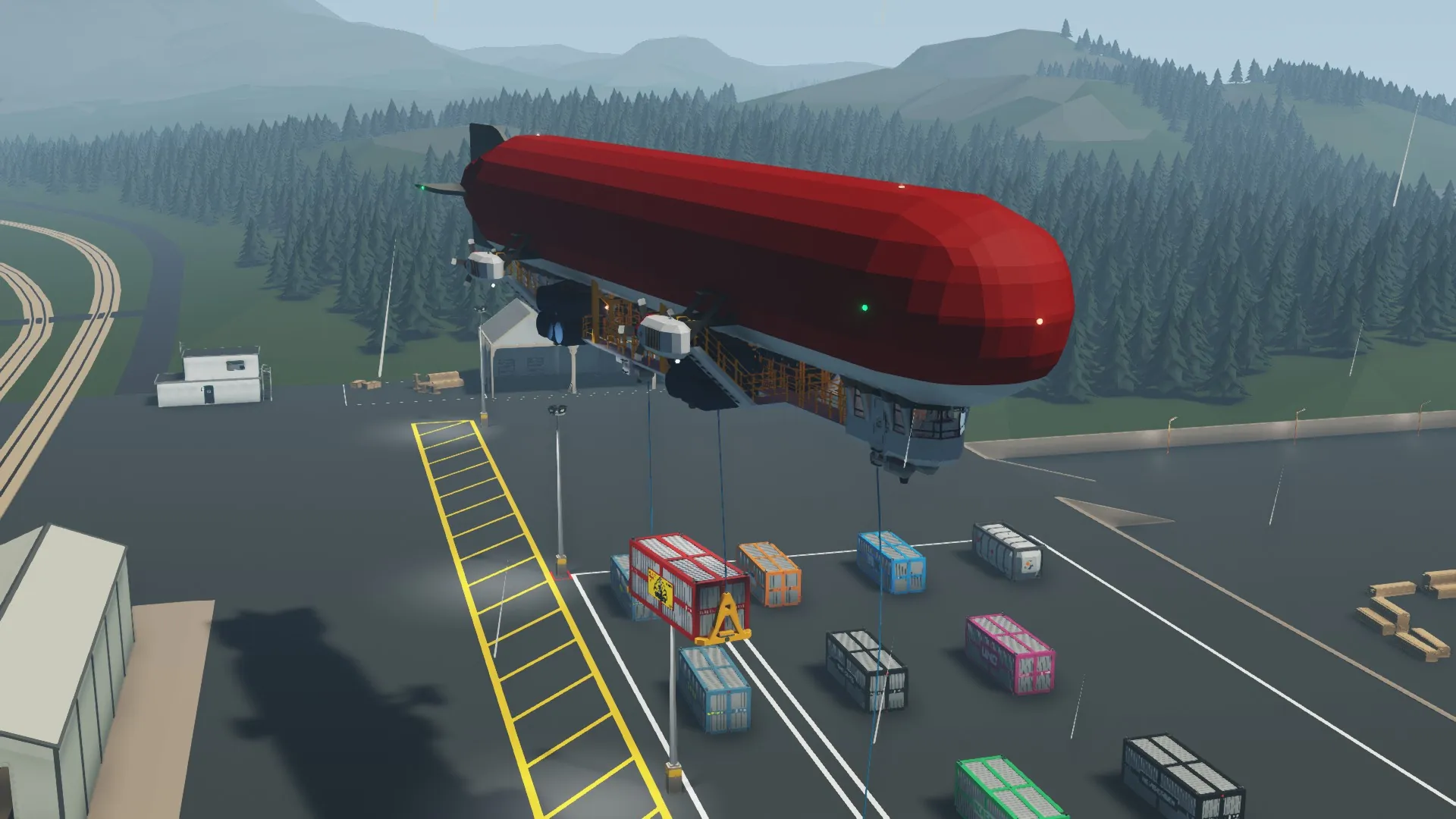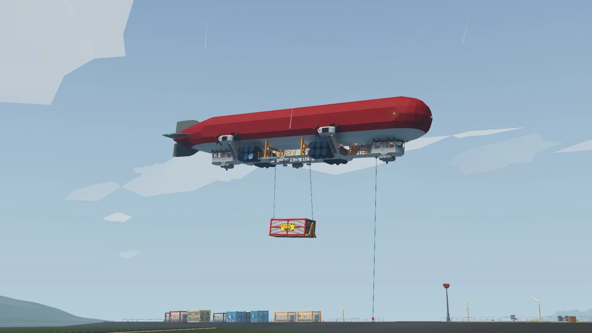 Features loading apparatus to ease container loading. Recommend moving the Jibs around with a rope connected to one of the two rope anchors on the jib. If you set the rope length to 1m when you connect it, you have much more control and can drag the jib around to containers with ease.