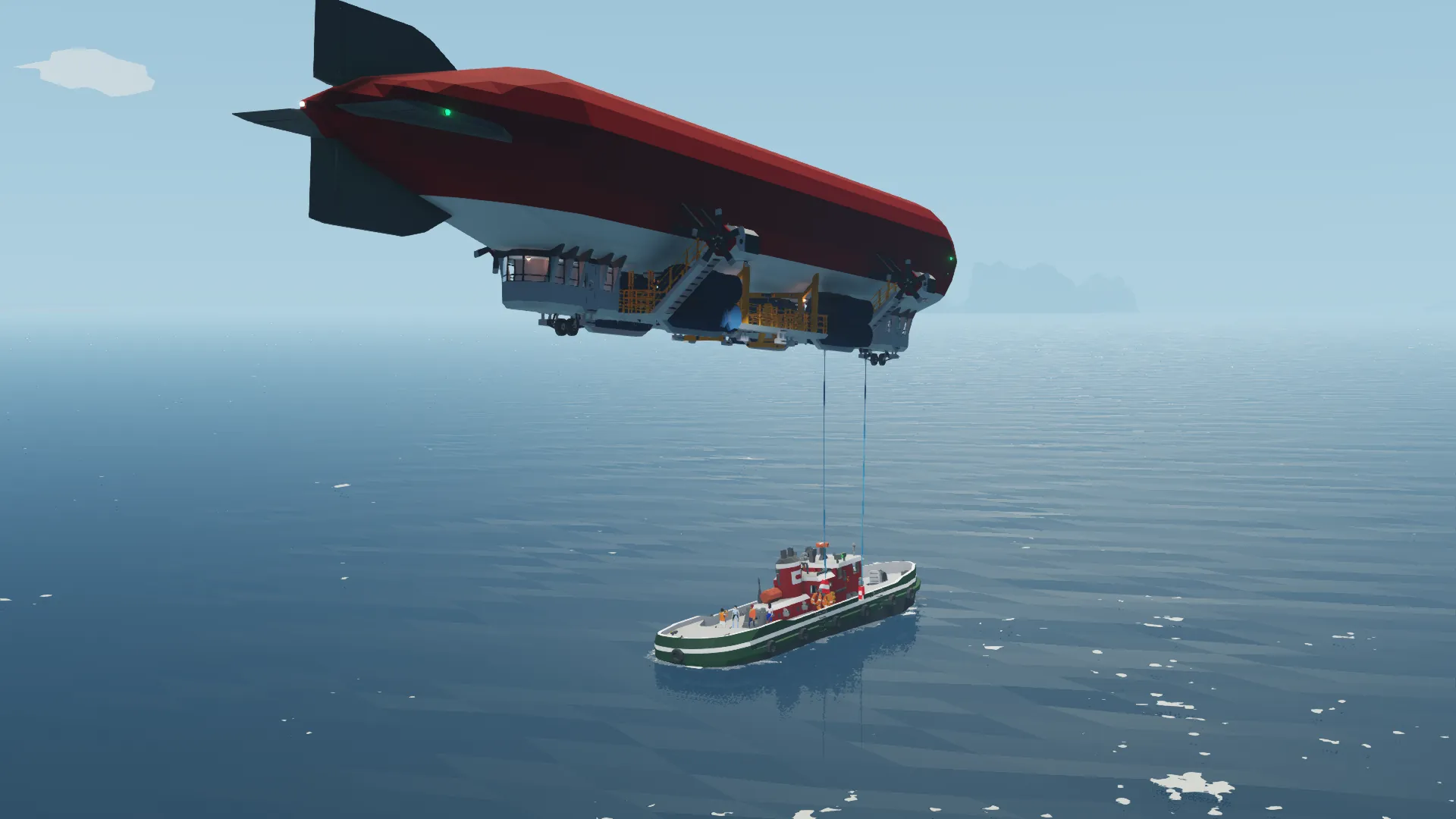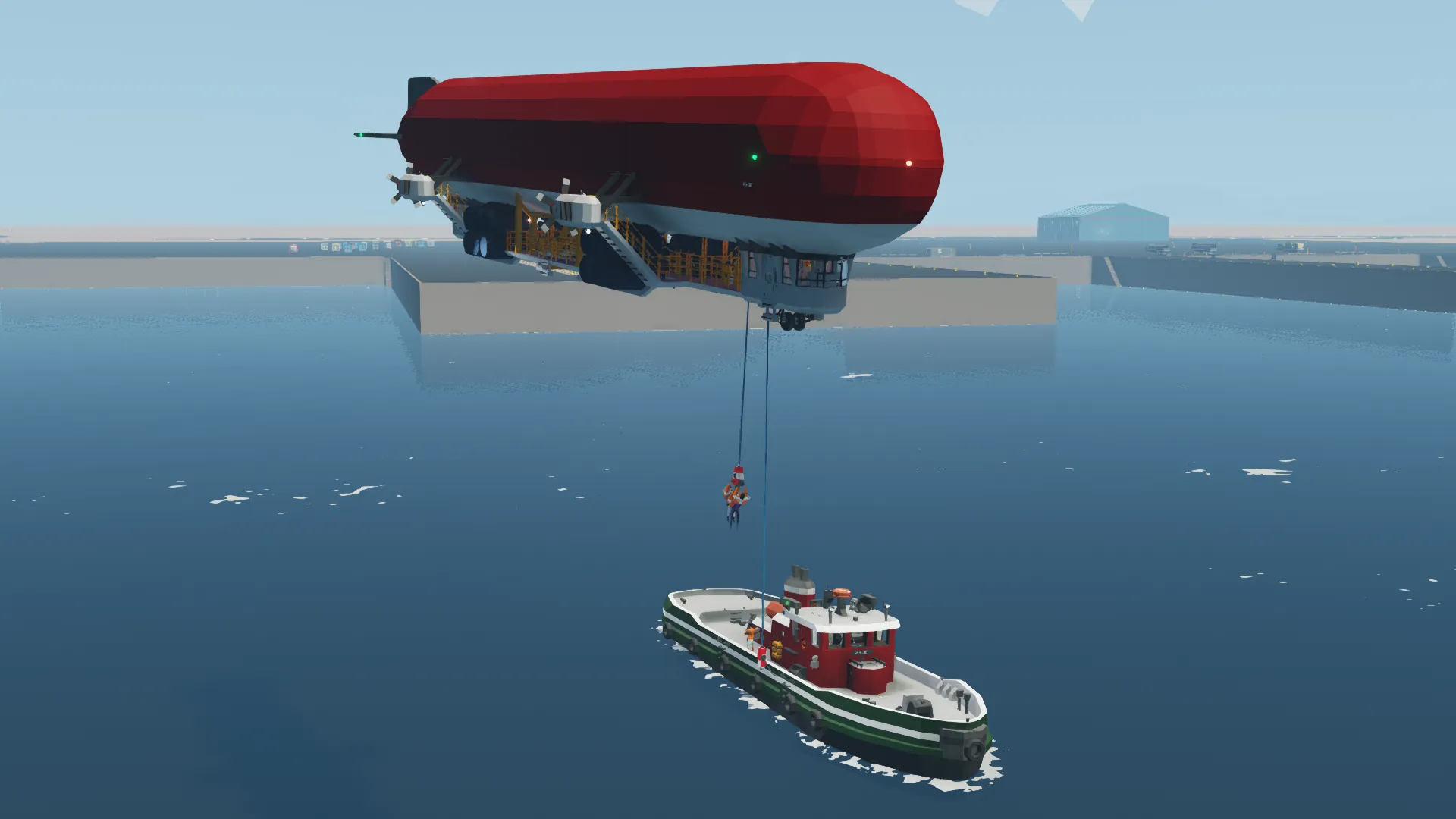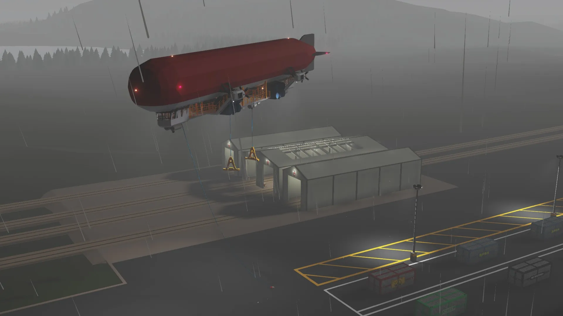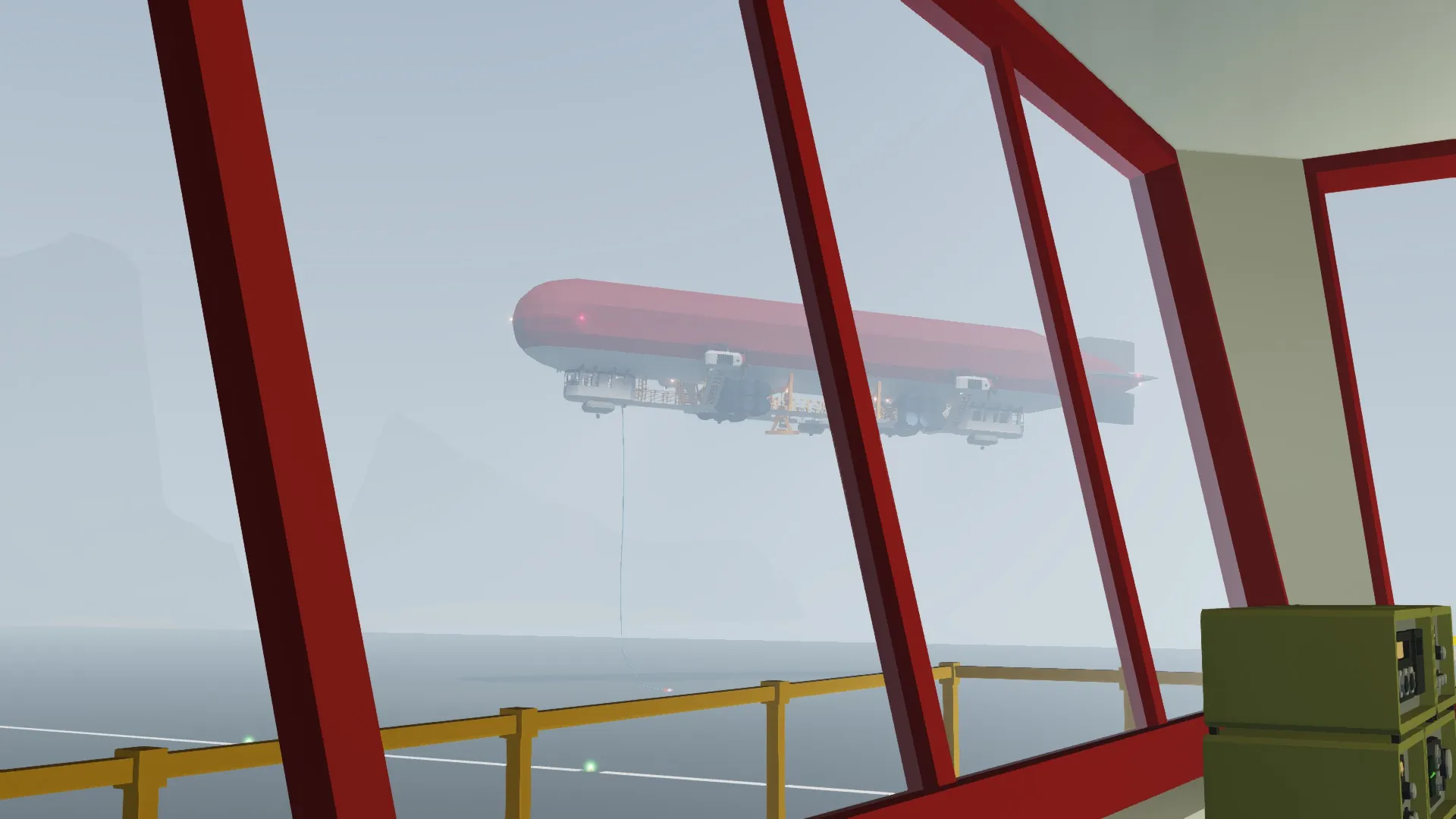 Landing can be a little tricky, ideally suited to a 2 man crew. One person at the helm controlling heading/engines to maintain positional control, and a second man on the secondary position to adjust ballast and mooring lines in order to land. It is advised to land into the wind, as this will allow you to maintain more control as your speed bleeds away.