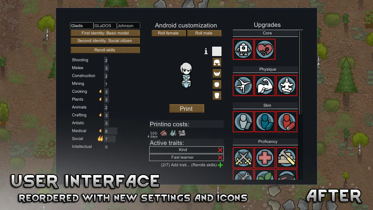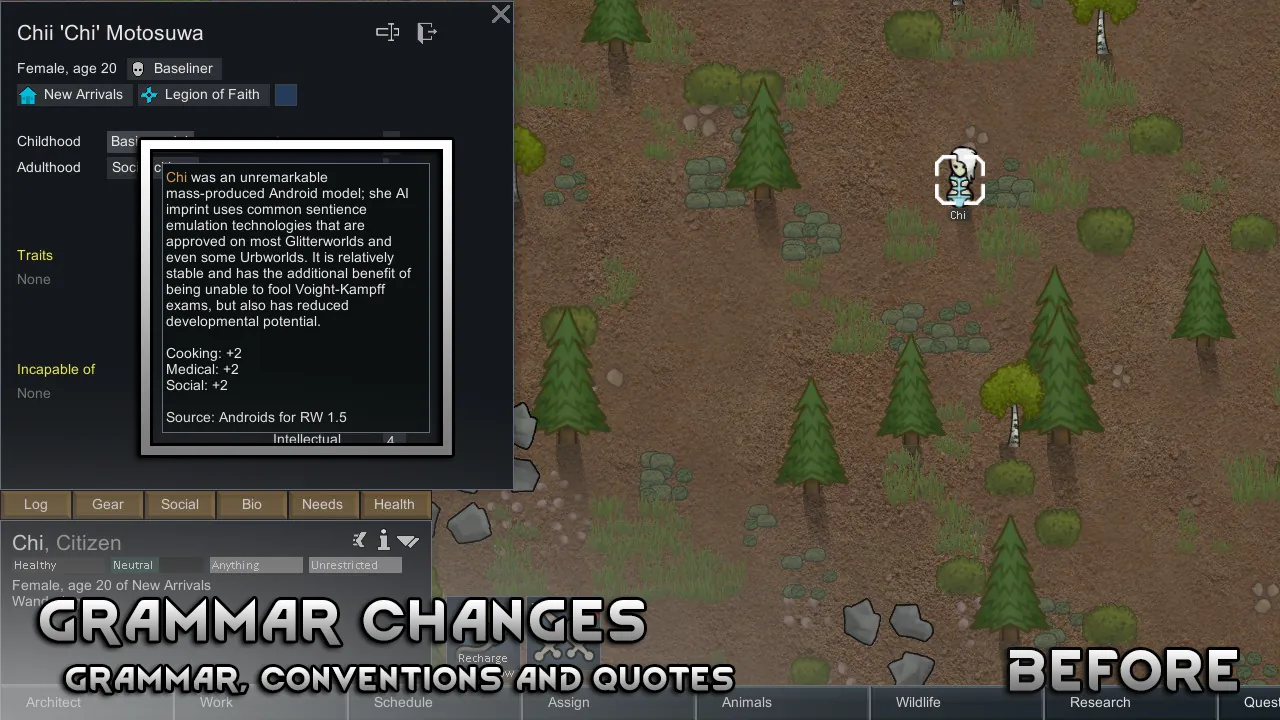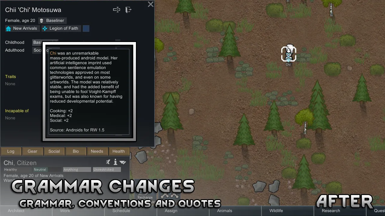 An overhaul mod that tries to polish the rough edges of Androids and Androids Expanded. Includes improvements to areas such as UI, apparel, research, grammar and general fixes.