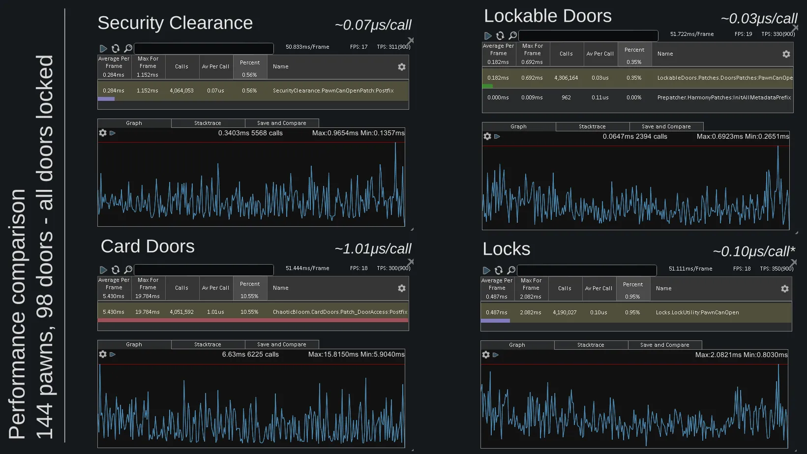 I benchmarked the mod with 144 pawns and 98 doors and compared it to some other popular door lock mods, which you can check in the last two preview images - TLDR, the mod should be ~14x faster than [url=https://steamcommunity.com/sharedfiles/filedetails/?id=3629205139]Card Doors[/url] and ~2x slower than [url=https://steamcommunity.com/sharedfiles/filedetails/?id=3391523928]Lockable Doors[/url] when processing locked doors as of 2026-01-03 (when I ran the benchmarks). When processing unlocked doors (meaning non-powered doors or doors with clearance set to None), it performs only slightly slower than Lockable Doors. [url=https://steamcommunity.com/sharedfiles/filedetails/?id=1157085076]Locks[/url] was also included, but might not be directly comparable since instead of running checks after the vanilla PawnCanOpen() method it completely replaces it.