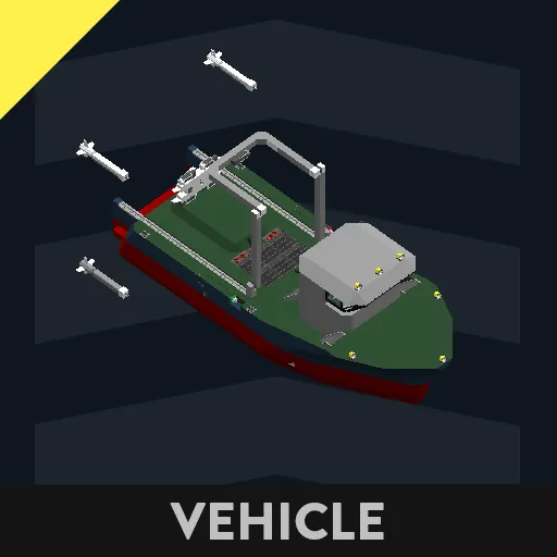 A sturdy mixed-fishing trawler built for costal and offshore work, matching the length of the beginner coastguard outpost dock. powered by a single large engine with a top speed of 20kph, its equipped with a folding crane for catch handing and a compact cabin with a bed for longer trips.