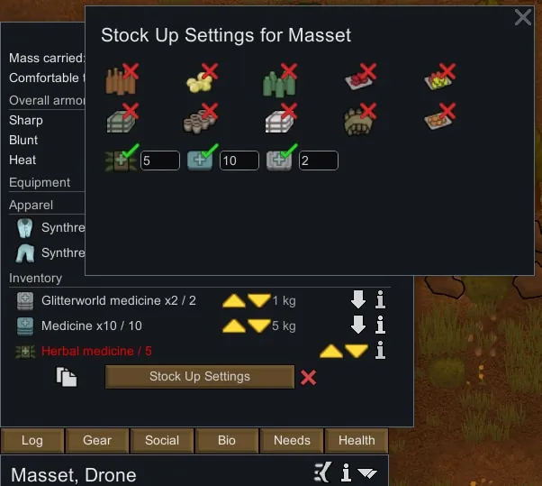 (Set up your medicine amounts from a button in the colonist's inventory Gear tab.)