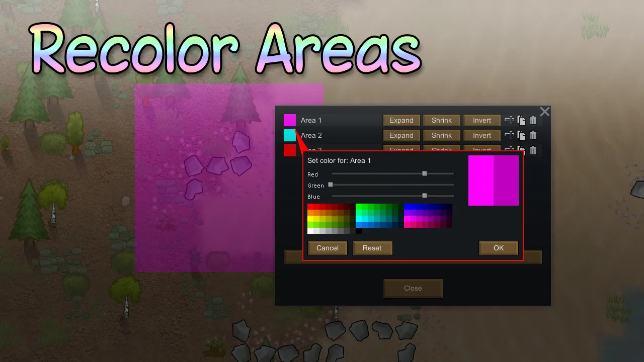 Dialog_RecolorArea also gives you full RGB control over Allowed Area colors; vanilla normally chooses a random color, then blends it with a 50% gray, which is why all vanilla Allowed Area colors feel faded.