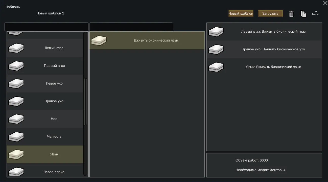 Шаг 1: Создайте шаблон. Через кнопку настроек шаблонов создайте новый шаблон, назовите его, а затем выберите все бионики/импланты, которые вам нужны, через интерфейс. Когда все предметы будут выбраны, закройте интерфейс.