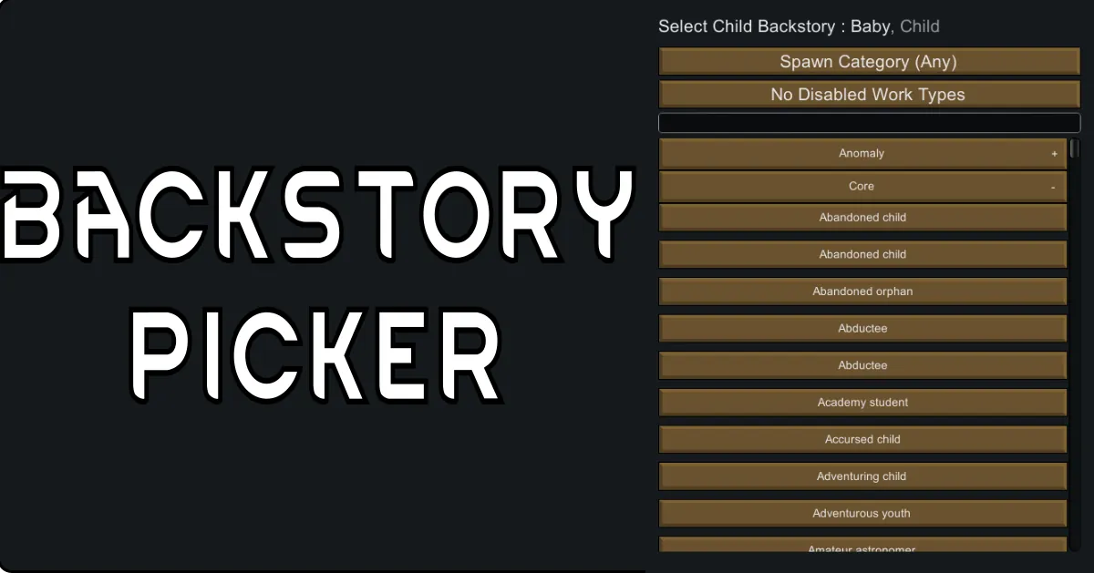 A small mod that allows you to pick the backstory of a colonist child when they turn into a child/adult.