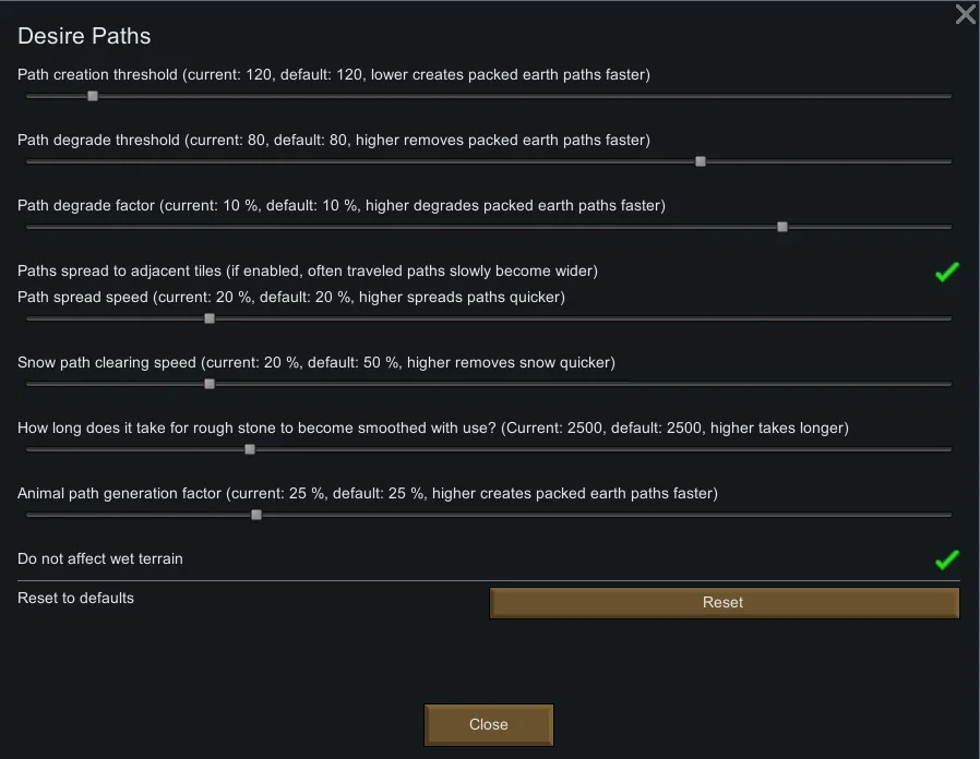 By default, any terrain that has the XML tag TakeFootprints' set to true will be 'packable', and given enough traffic, packed dirt paths will appear. As of version 0.7.97, the mod reads a DefModExtension on terrain defs. This extension has two fields, 'disabled' and 'packedTerrain'. These allow you to disable desire paths' behaviour for a specific terrain, or specify which terrain def should be used for the created path.