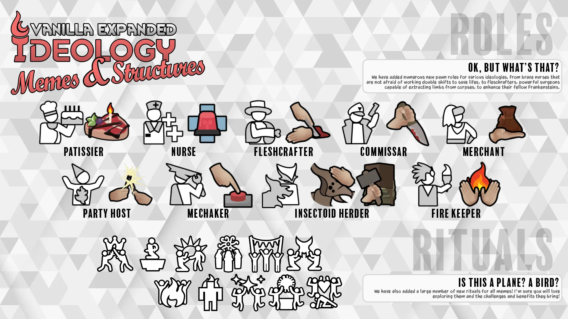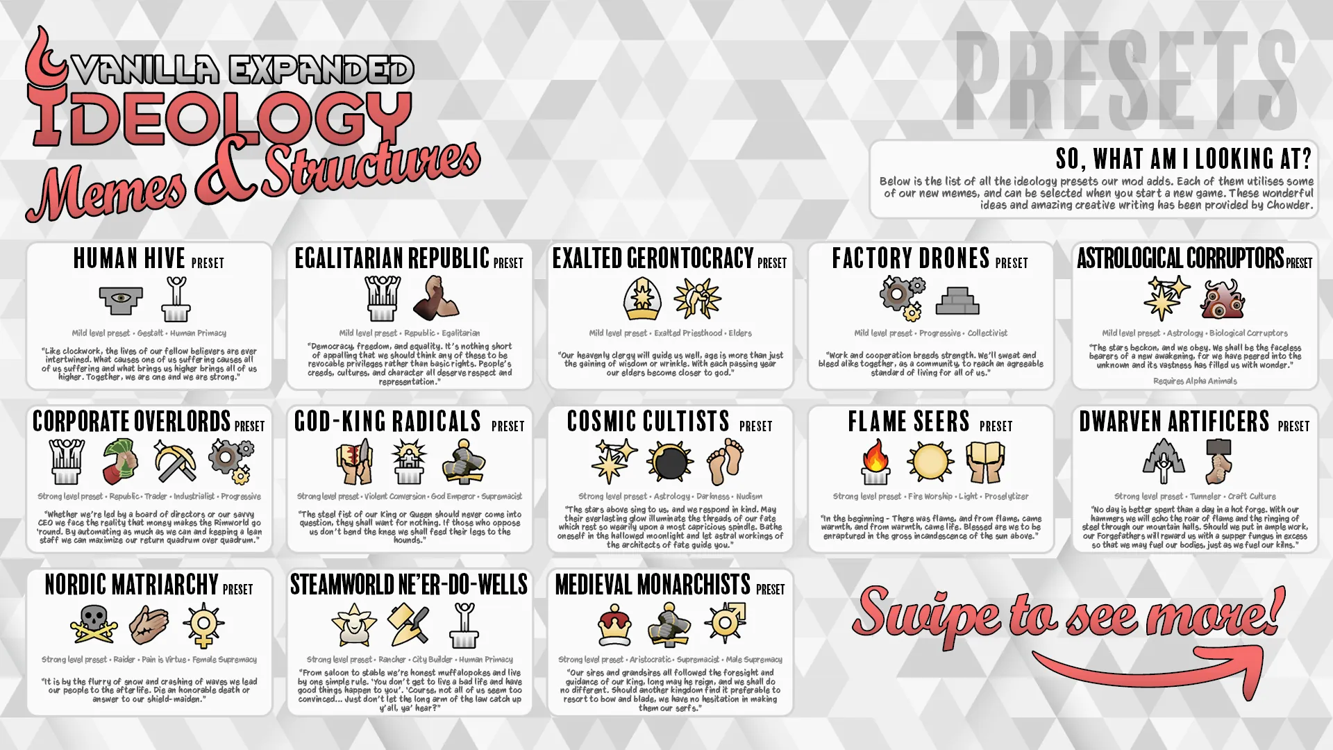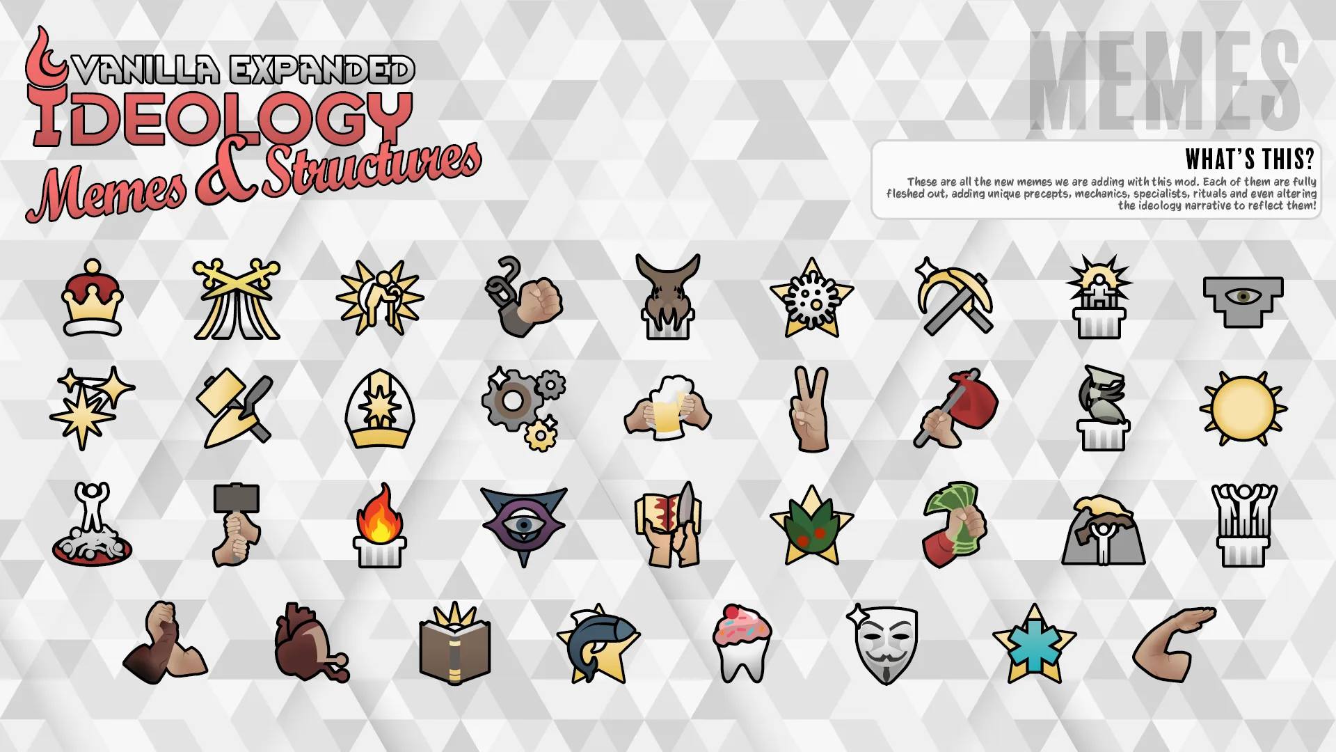 Vanilla Ideology Expanded is a mini-series of mods aimed at expanding the content in ideology - be it memes, relics and symbols or icons alike.