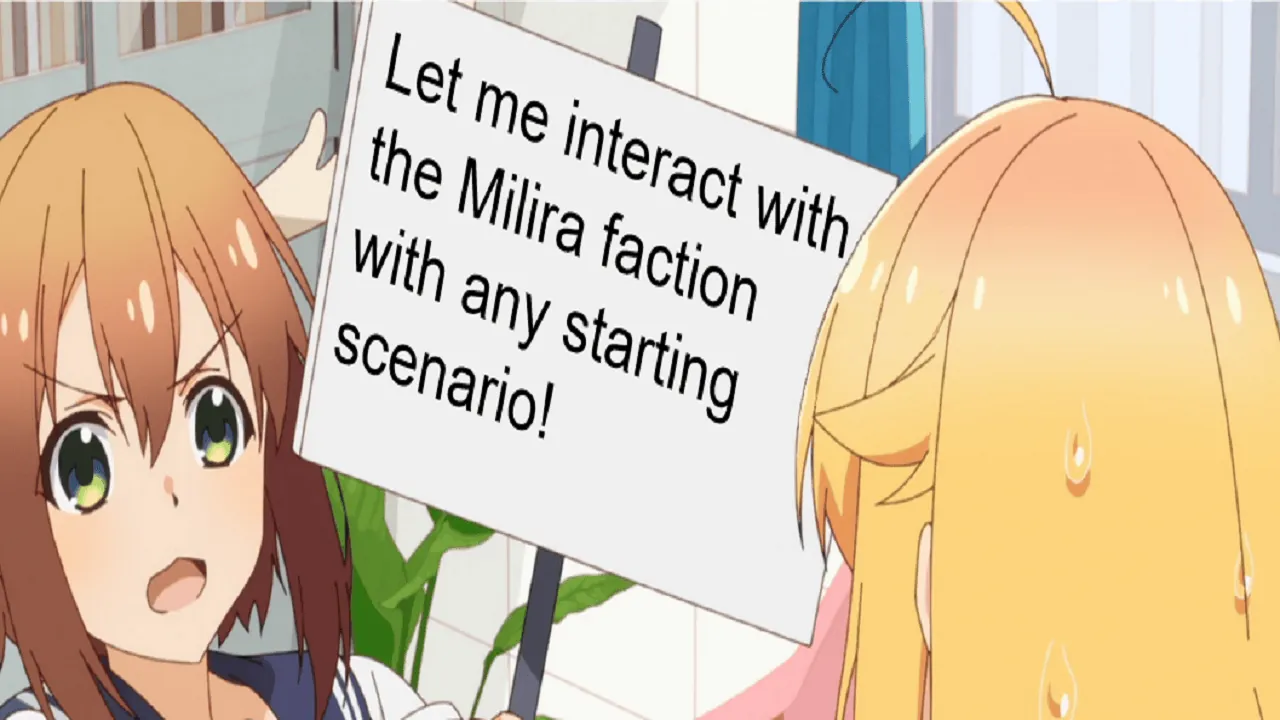 Changes the Milira faction from the Milira Mod to no longer be permanently hostile to non-Milira starting scenarios. That's it.