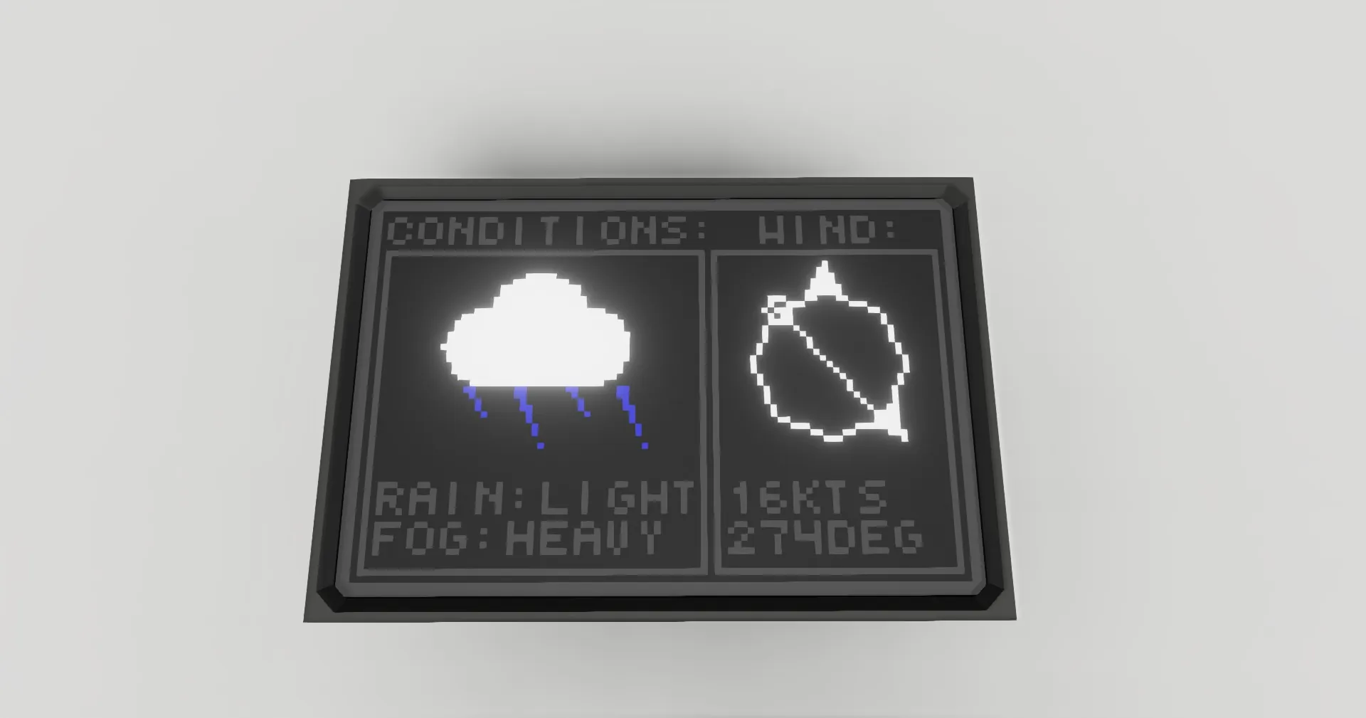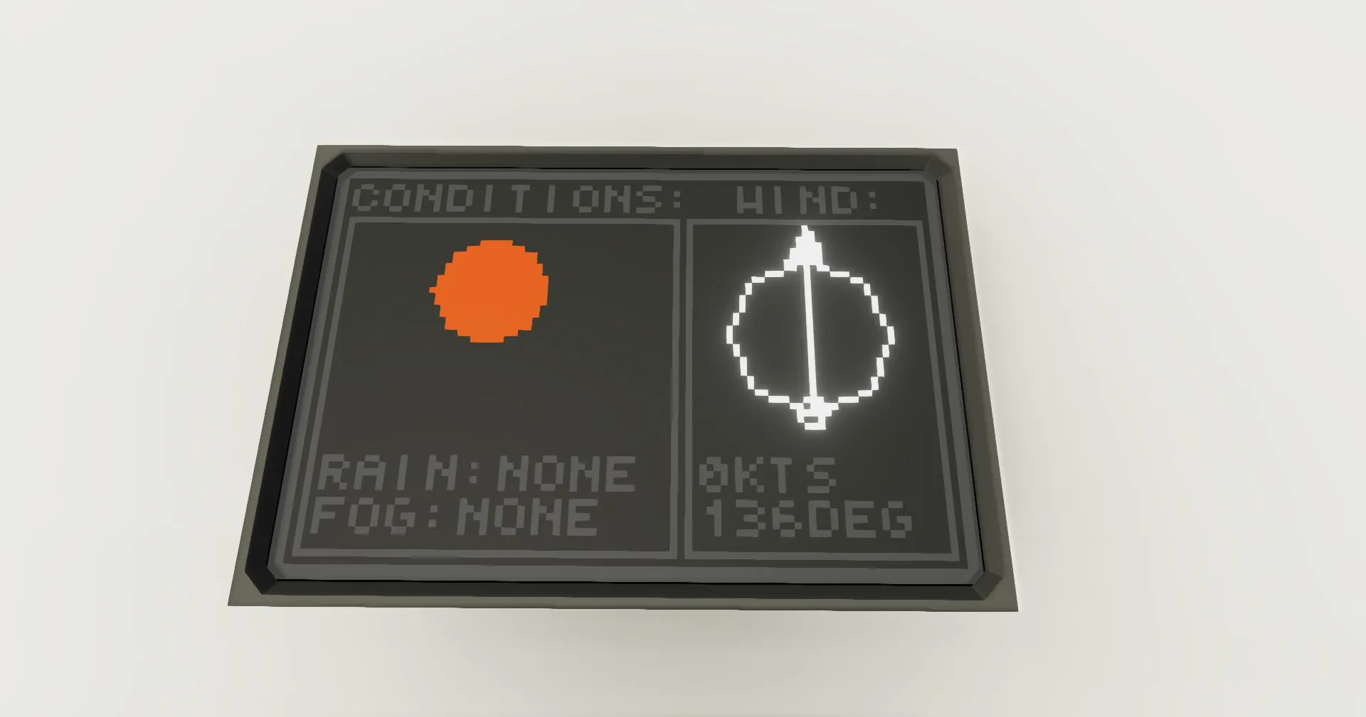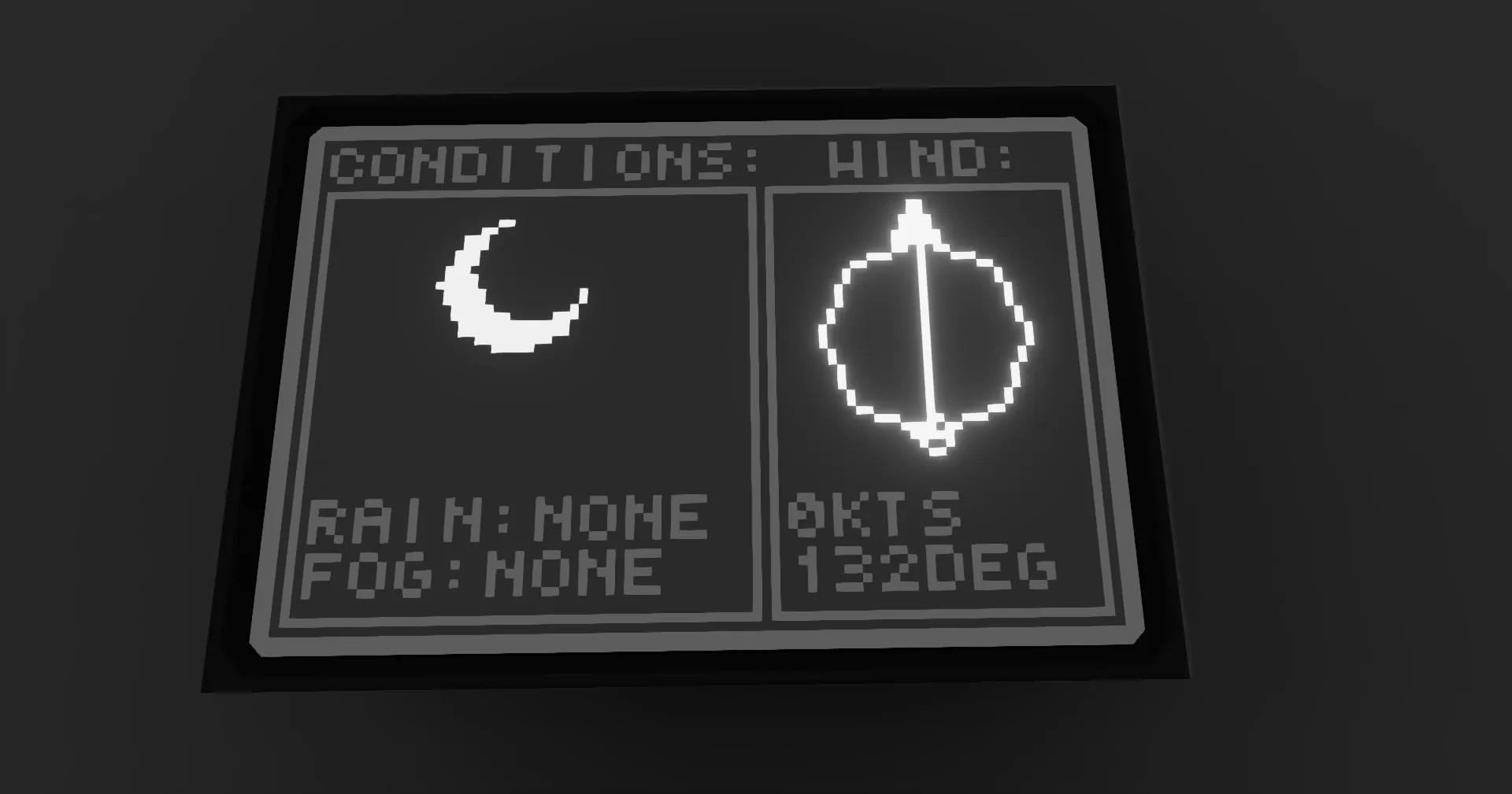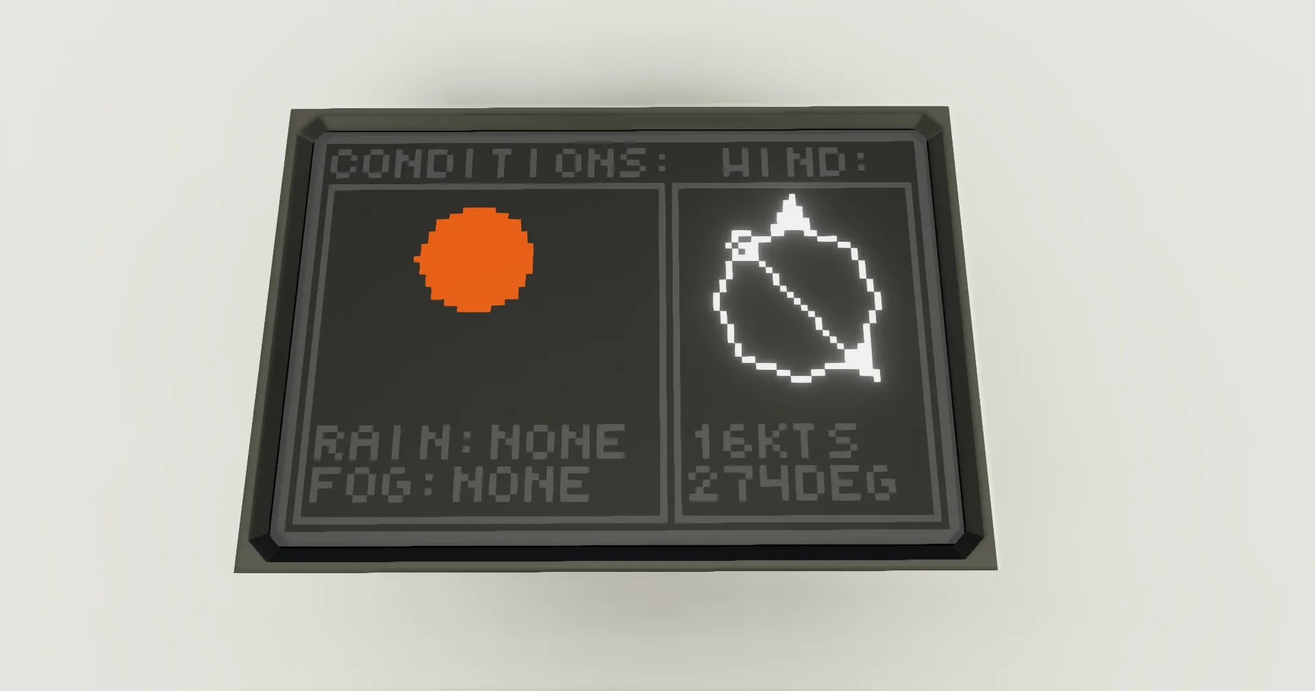 This is a basic weather screen, displaying data for wind, rain, and fog. The left section of the screen shows you conditions, which include rain and fog levels, and an icon indicating current conditions. The right side of the screen shows you wind data, with a circle indicating the wind's direction relative to you, and underneath it wind speed in knots, and heading in degrees.