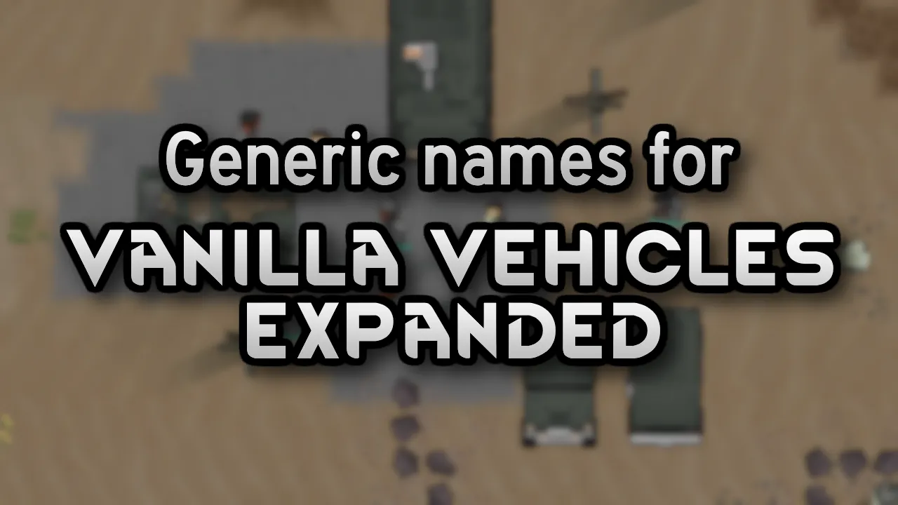 This is a patch to change the names of the vehicles from Vanilla Vehicles Expanded to be more vanilla-friendly. Patches are included for the base mod, the Tier 3 expansion, the Vehicles Wrecks Expanded mod, the Snow Crawler mod, the Titan Vehicles mod and all mentions of these vehicles - from the labels of the vehicles to research project names and rulestrings used for book generation, are relabeled to reflect the vehicles' new generic names. I also took the time to rewrite every vehicle description to be less verbose and more useful. I also replaced all mentions of tier 1 and tier 2 with basic and complex respectively, since that's what the original research project refers to the tiers as.