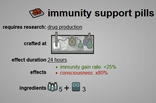 This mod intents to add ways to fix the lack of options a player has in terms of doctoring. For example, if a pawn gets sick, there's nothing the player can meaningfully do to help them beat the infection if you have a bad doctor. Now, that pawn has a fighting chance if you give them one of the immune system enhancing drugs.