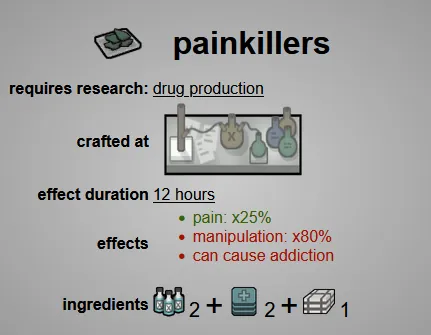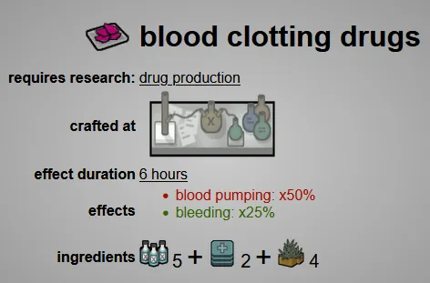 Additionally, the mod is intended to remain balanced by having a high material cost for the drugs relative to their bonuses, as well as a variety of tradeoffs to ensure that running them full time isn't as a viable option