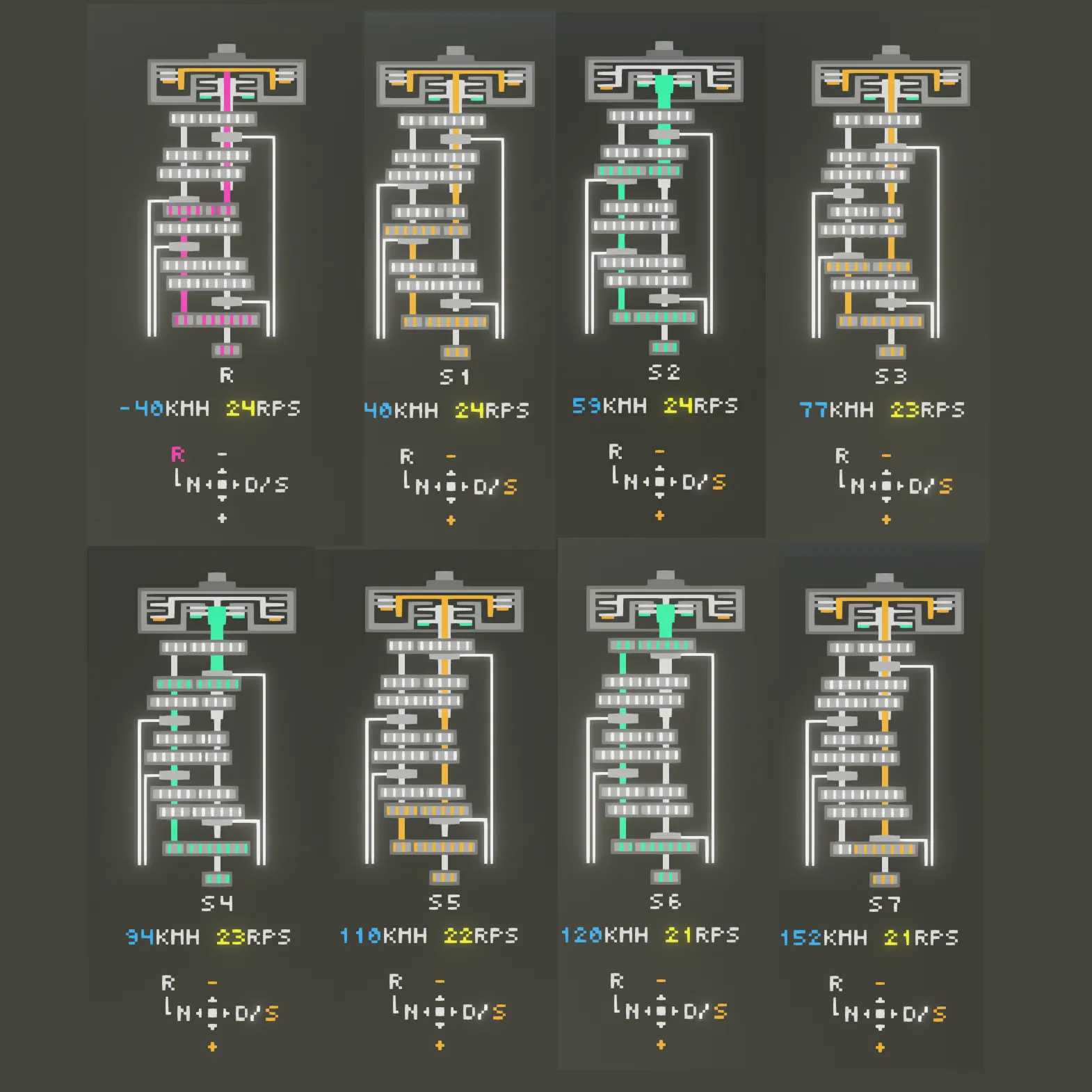 The gears are 7 forward speeds, 1 reverse speed, and neutral.