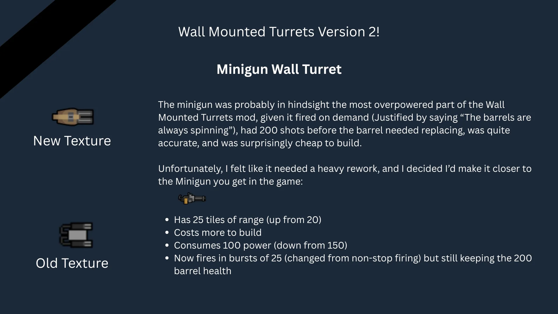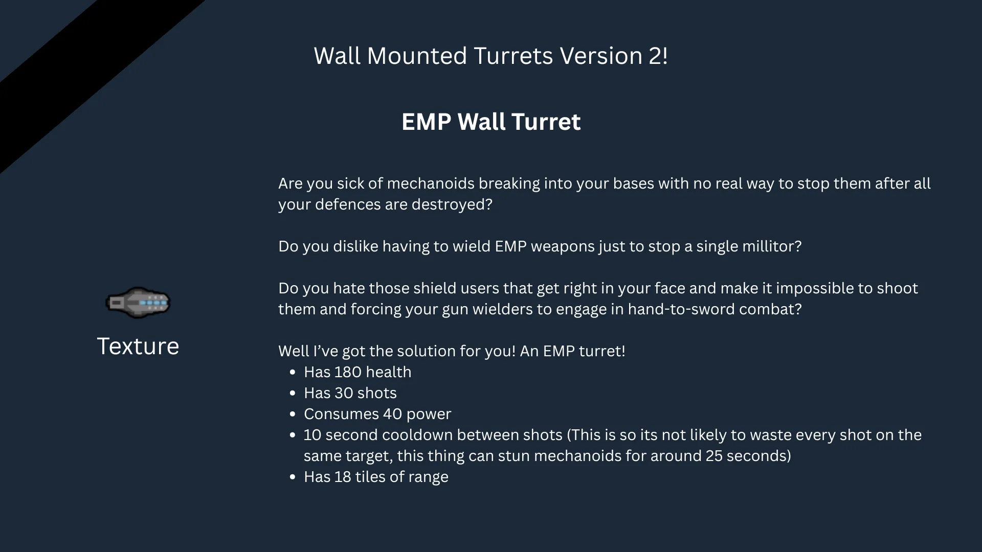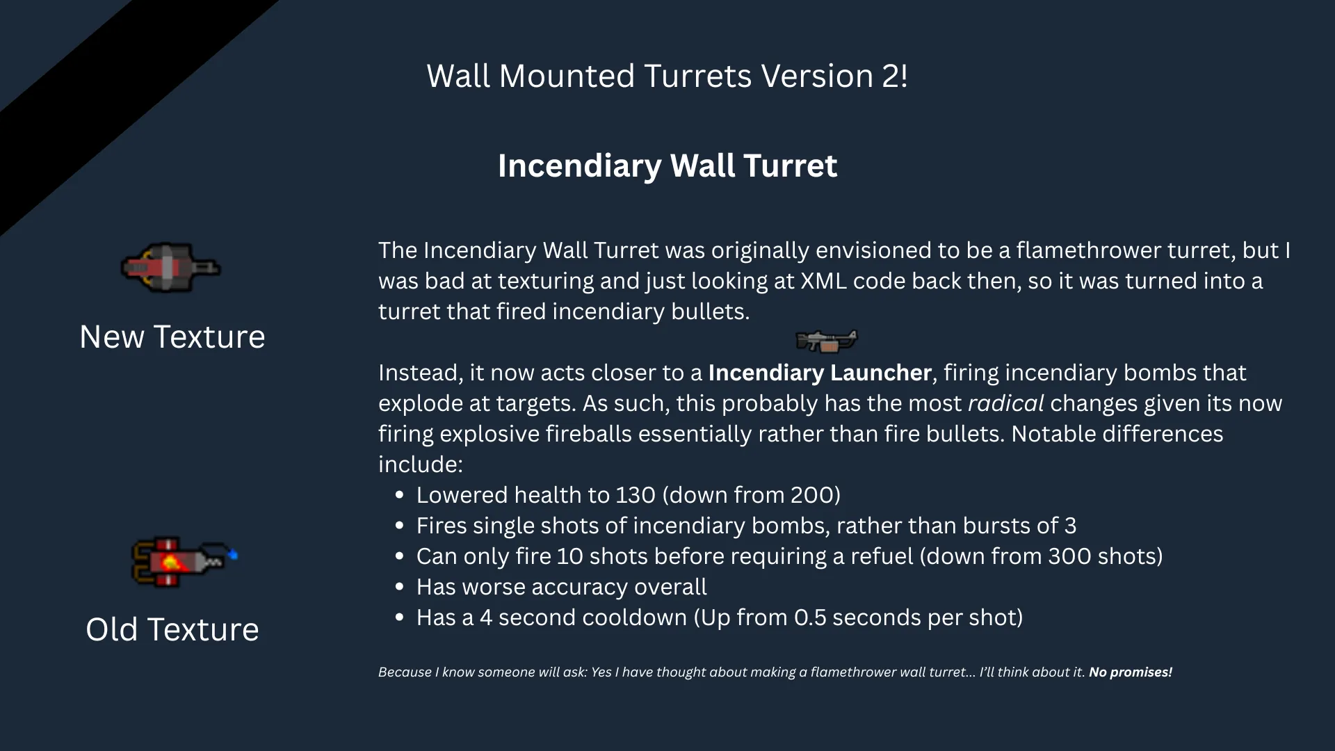 [i]I should stress, I gave my full permission for Mlies to continue updating my version, I even made an addition to the mod with their help a couple years back making the [b]Stun Wall Turret[/b] using equally crude textures like the rest. I even forewarned them of my intentions with this V2 and told them they are free to continue updating V1 if they so wish.[/i]