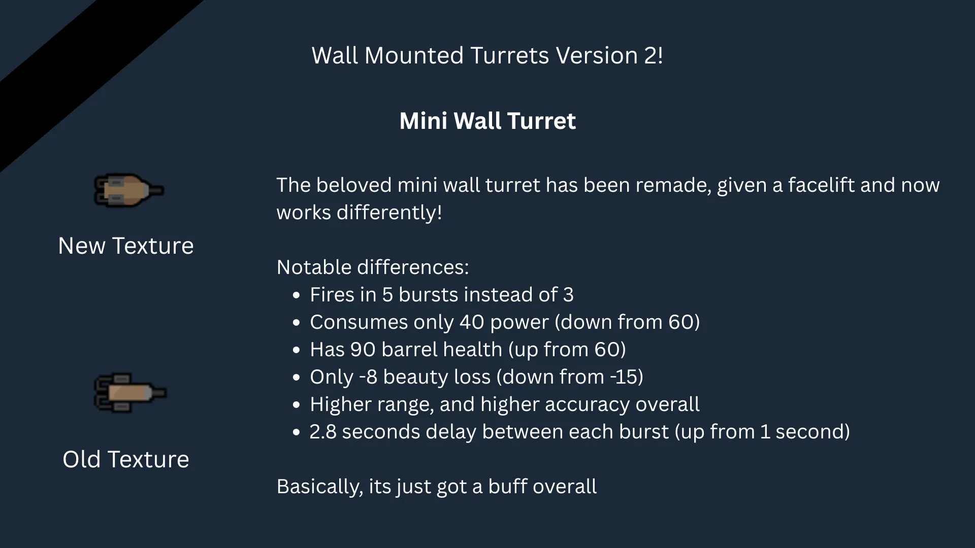 If you're looking at this, there's a good chance you're either wondering "Version 2? What's version 1?" or wondering why I'd remake the mod that was [url=http://steamcommunity.com/workshop/filedetails/?id=2015445164]being updated by another member of the RimWorld community[/url] - Put simply, I came back during Odyssey's announcement and release, and I looked back at my old mod, I was surprised to see that a few others [url=https://steamcommunity.com/sharedfiles/filedetails/?id=3263577410&searchtext=wall+mounted+turrets]had attempted[/url] their [url=https://steamcommunity.com/sharedfiles/filedetails/?id=3224715810&searchtext=wall+mounted+turrets]own versions[/url] of this mod, [url=https://steamcommunity.com/sharedfiles/filedetails/?id=2915769549&searchtext=wall+mounted+turrets]including one that redid my textures![/url]