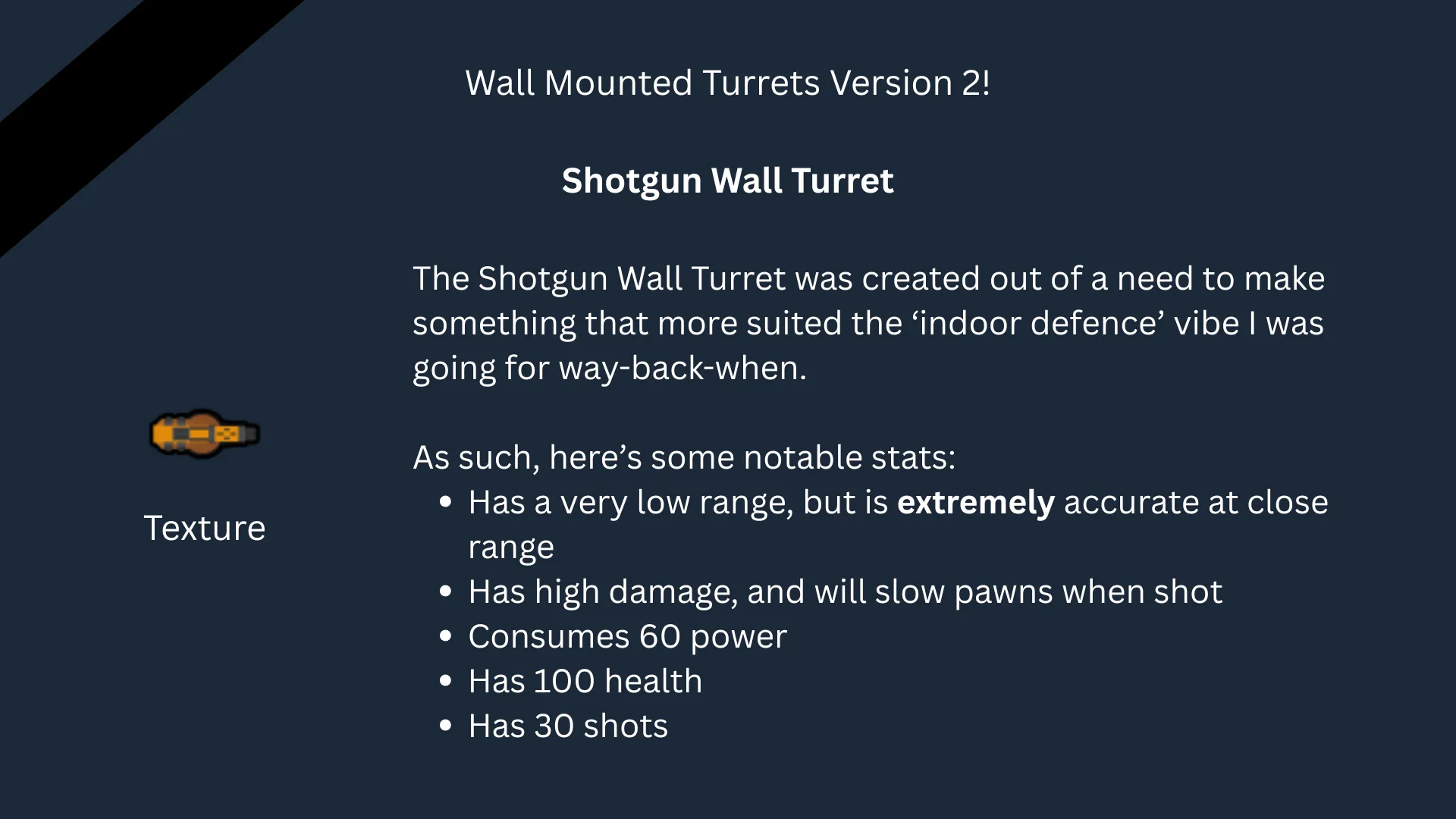 [*] Look at my [url=https://steamcommunity.com/sharedfiles/filedetails/?id=1812077718&searchtext=wall+mounted+turrets]original version back in 2019[/url]