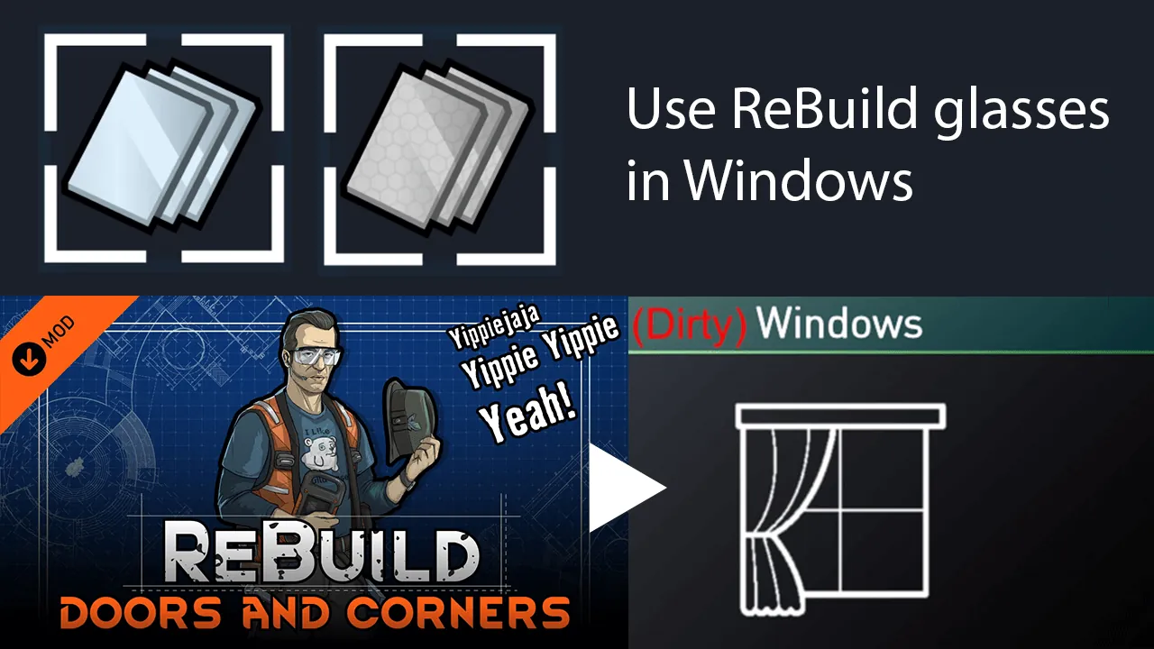 A patch for Window to use "Glass" from Rebuild: Doors and Corners mod instead of "Glass Pane"