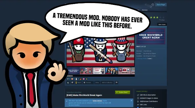 Why did I make this mod? Because I think it’s funny. A while back, someone suggested to me that I name one of my mods “Make RimWorld Great Again,” and I thought that was hilarious. I immediately began making plans to create a mod worthy of such a title.