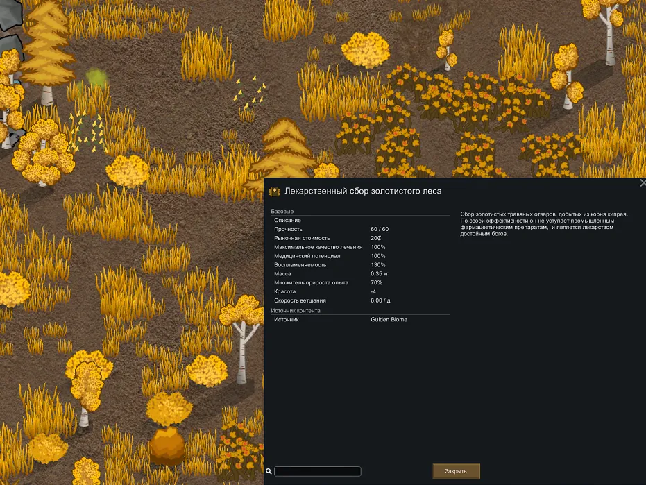 Gulden добавляет новый полный, упрощающий игру, биом. Все растения придают красоту, а также новый каменный материал и овечья шерсть, которые делают то же самое. А также лучшее травяное лекарство, которое так же хорошо, как и промышленное лекарство, и, наконец, новая ягода, которая действует как своего рода шоколад, уменьшающий отдых.