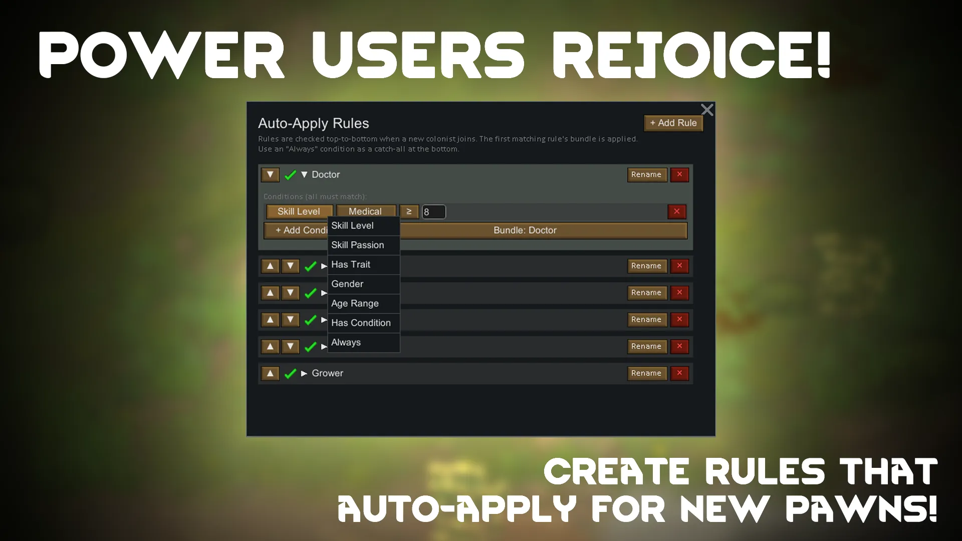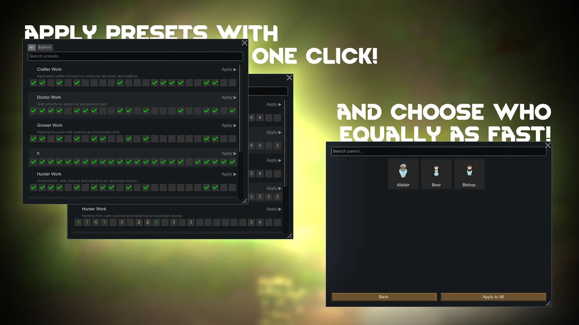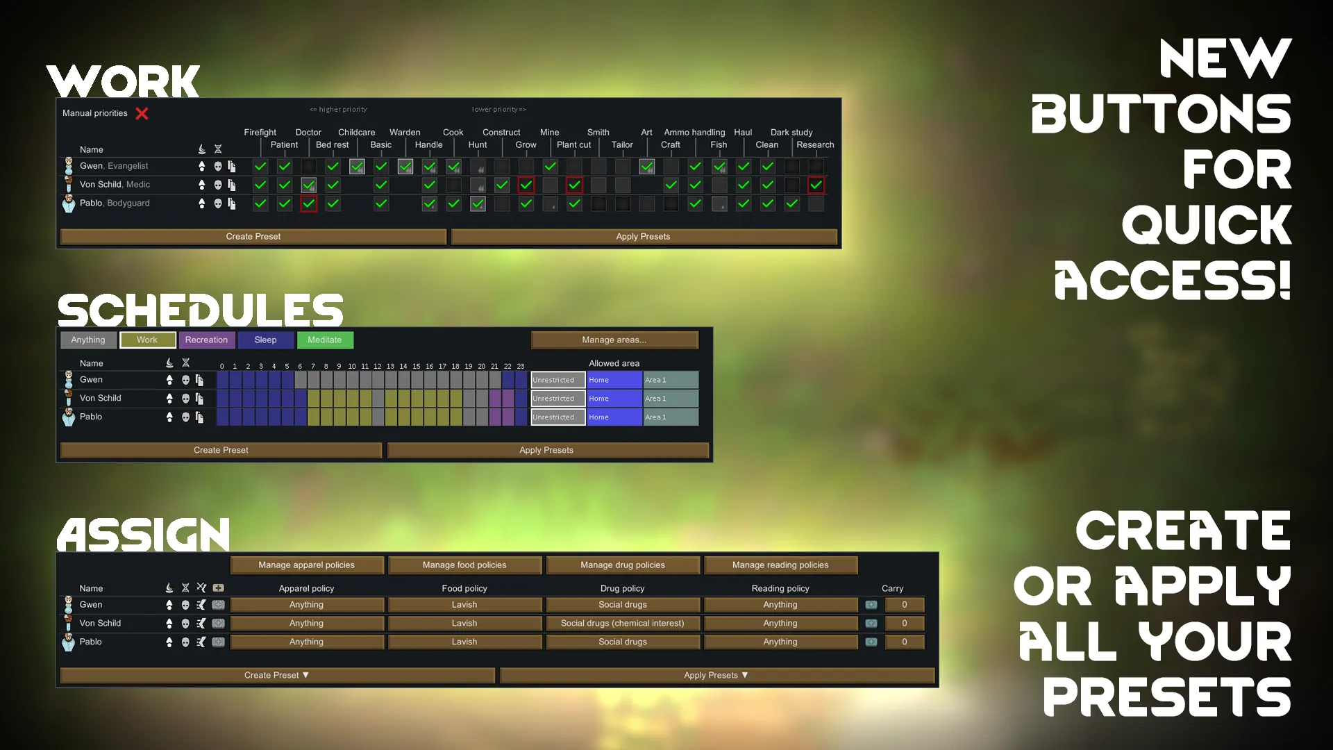 Pawn Presets lets you save configurations as a reusable preset: schedules, work priorities, outfits, food restrictions, drug policies, and reading policies. Apply them to any pawn in any colony with a single click. Create bundles to apply multiple presets at once, or even set up auto-apply rules so new colonists configure themselves.