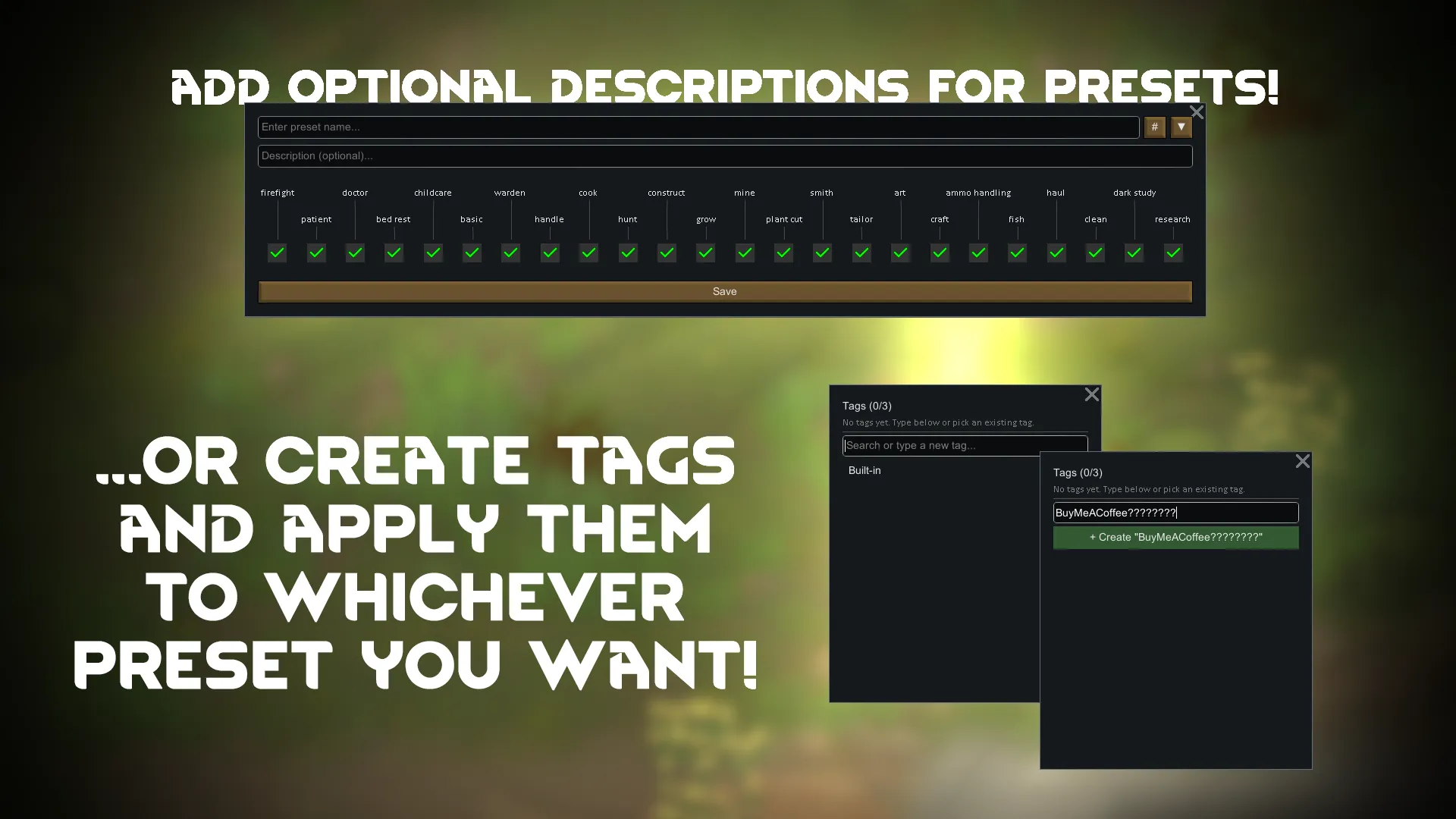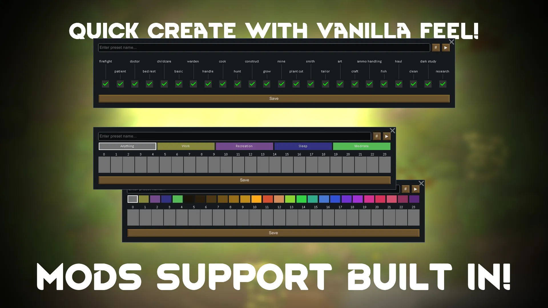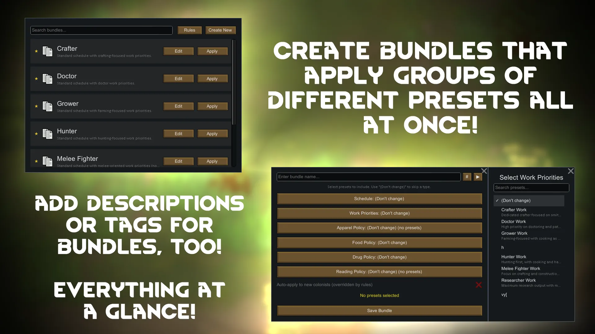 [*] Combine multiple presets into a single bundle (e.g., "Combat Colonist," "Night Owl Crafter")