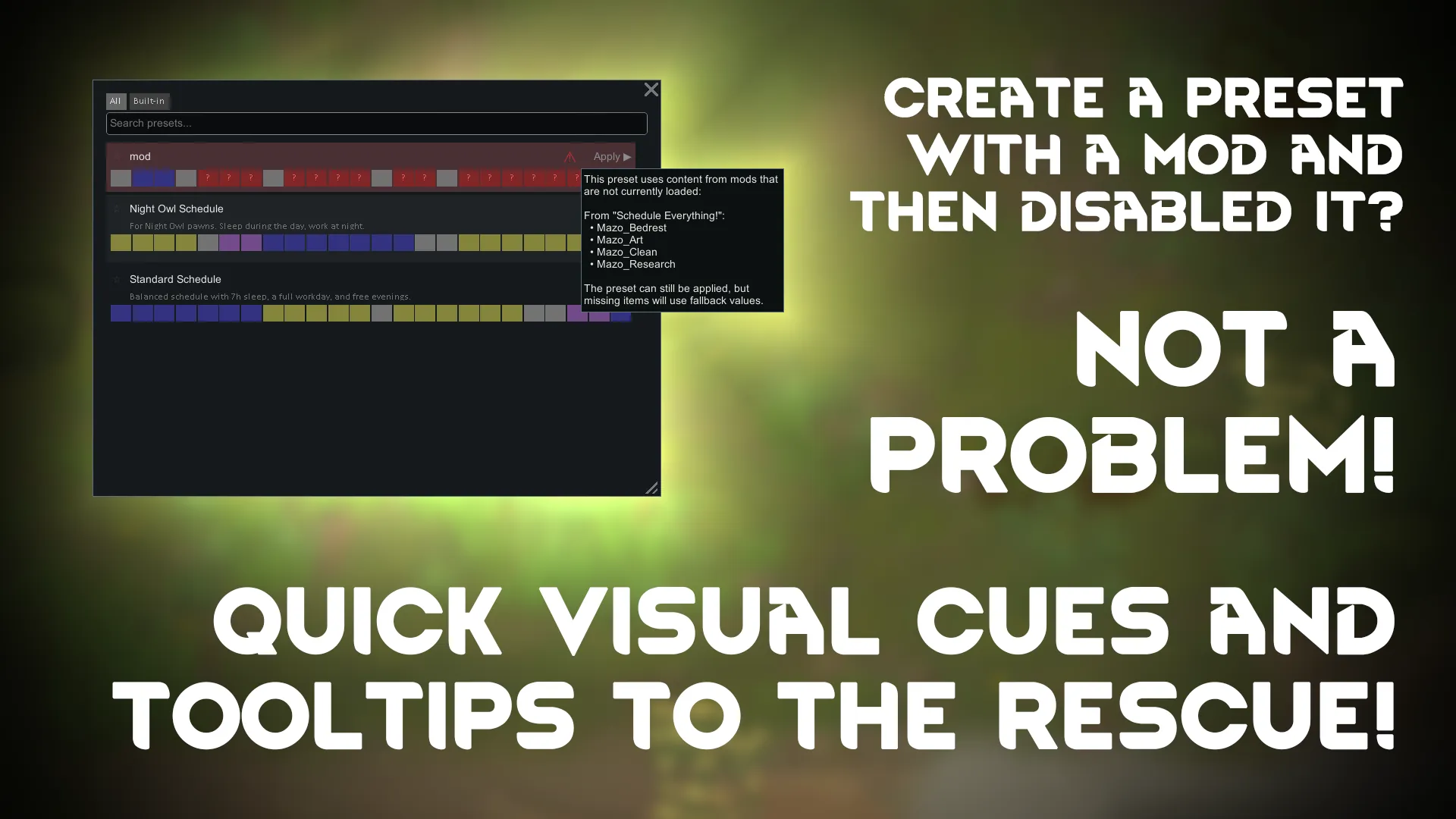 The highly awaited sequel to my Schedule Presets mod! Never again be plagued with micromanaging.