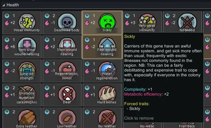 Adds a gene that forces the pawn to have the Sickly trait, in exchange for a small metabolic efficiency bonus - Sickly can be fairly expensive in terms of labor and medicine and pawn mood to cope with, especially if every pawn in your colony has it, so the amount of the bonus (+2) reflects that.
