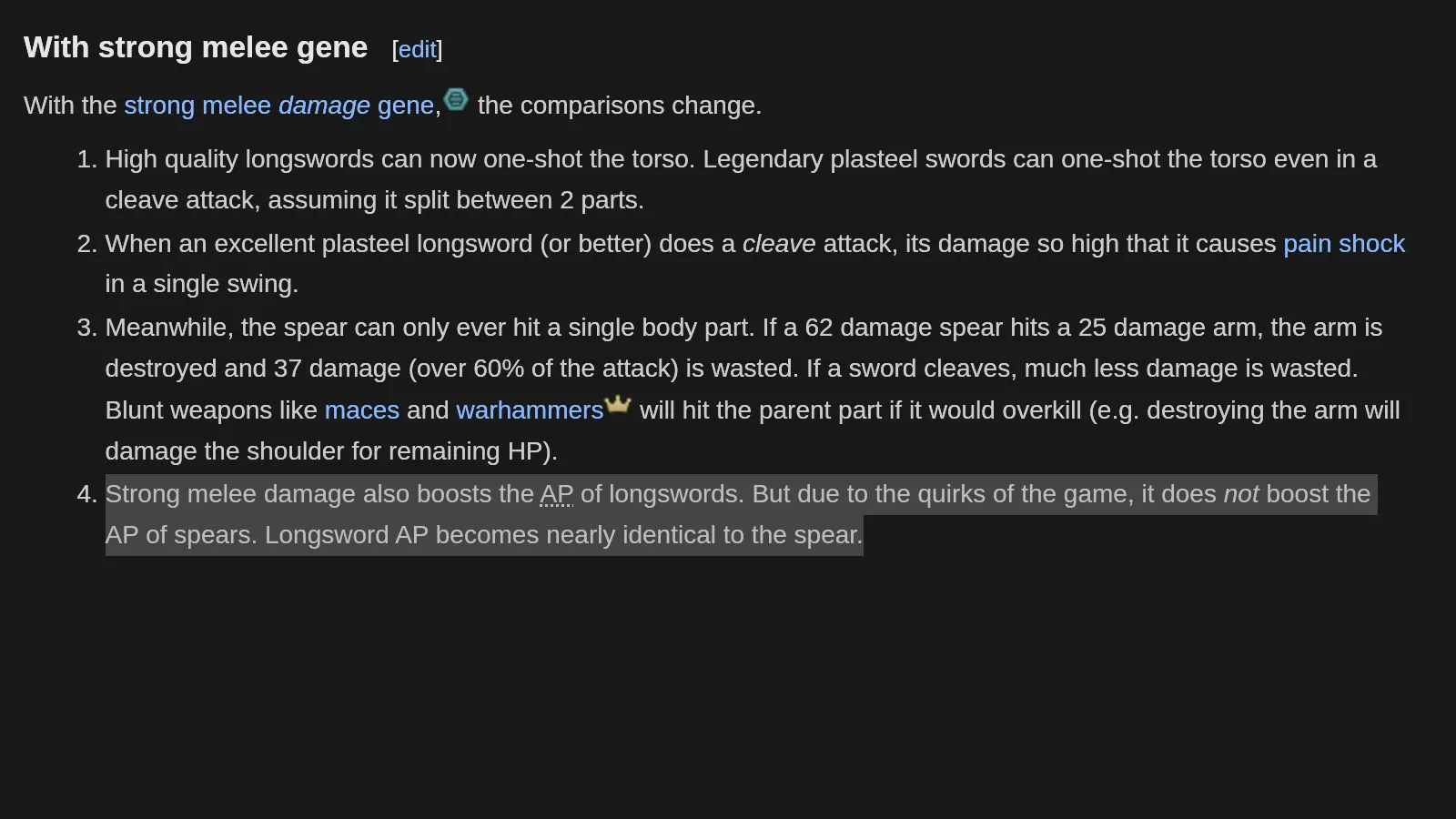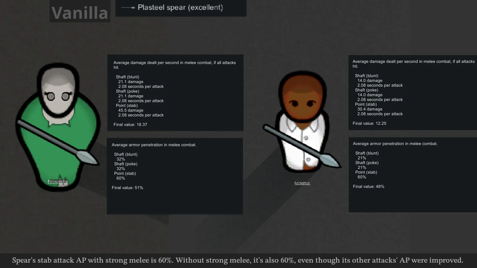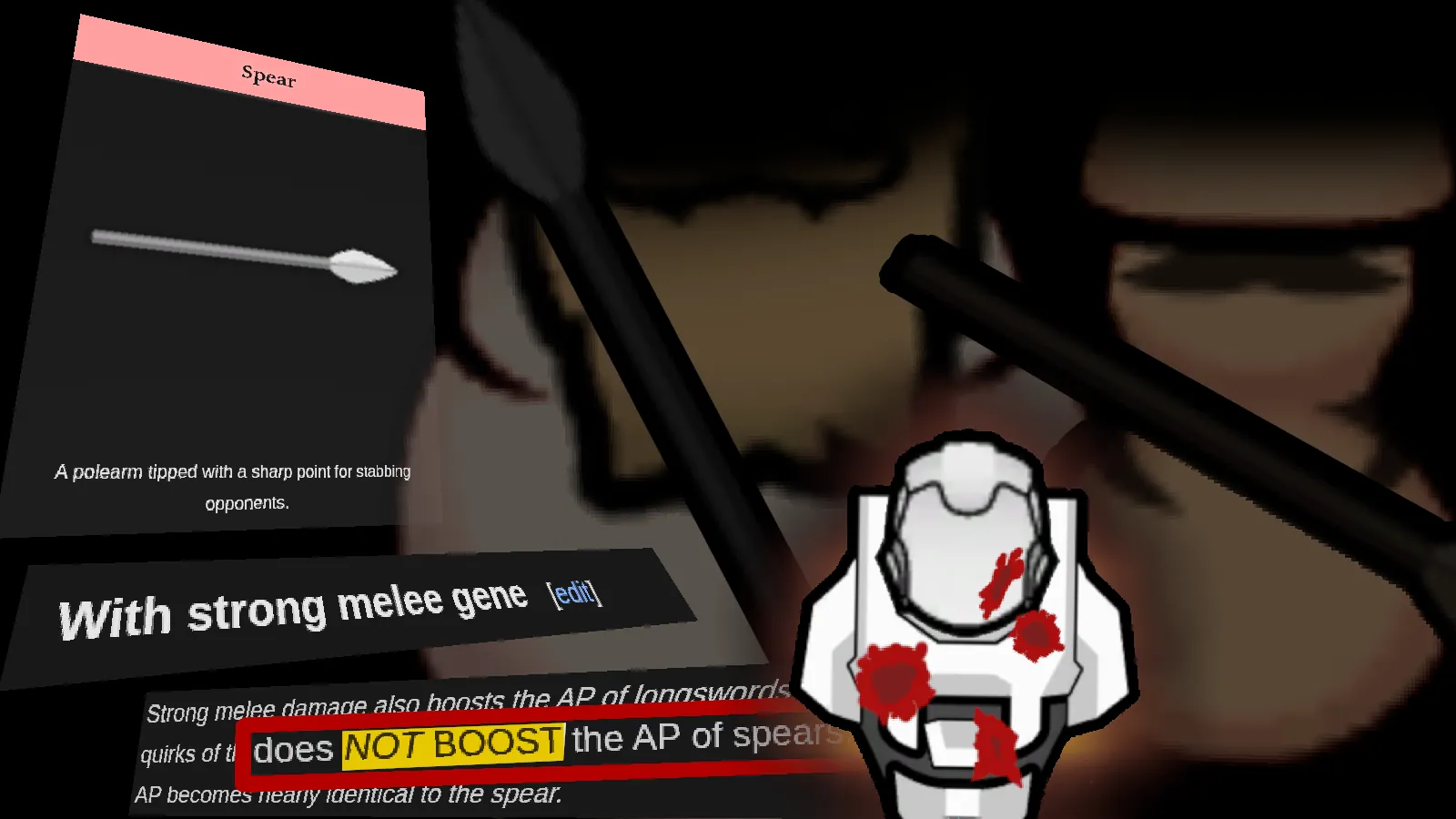In the analysis of the spear, it's apparent that with the strong melee damage gene, the spear becomes almost obsolete because it loses its AP advantage against the longsword, which was its only advantage it had, since spear only does stab damage, which is generally worse than longsword's cut.