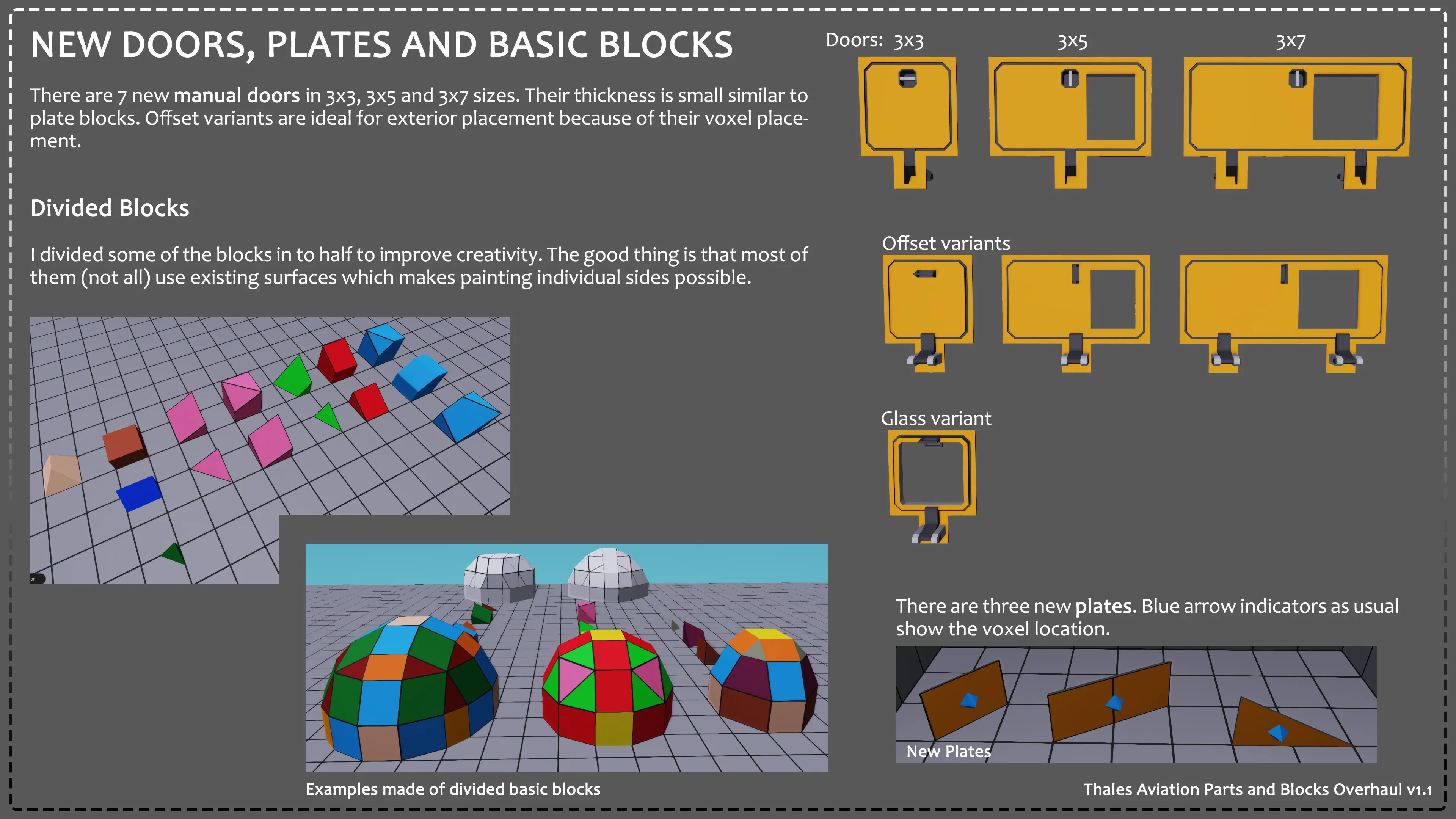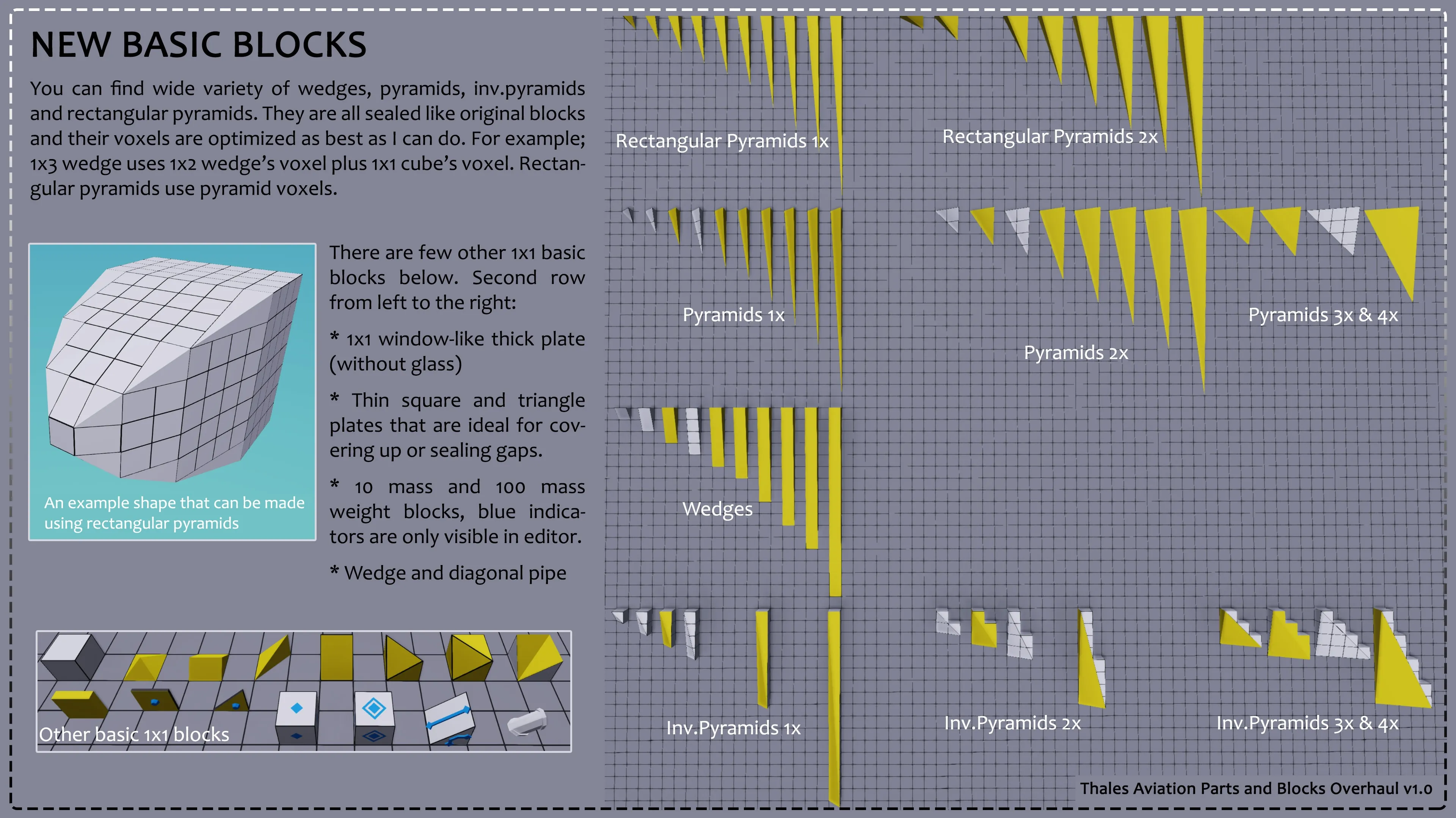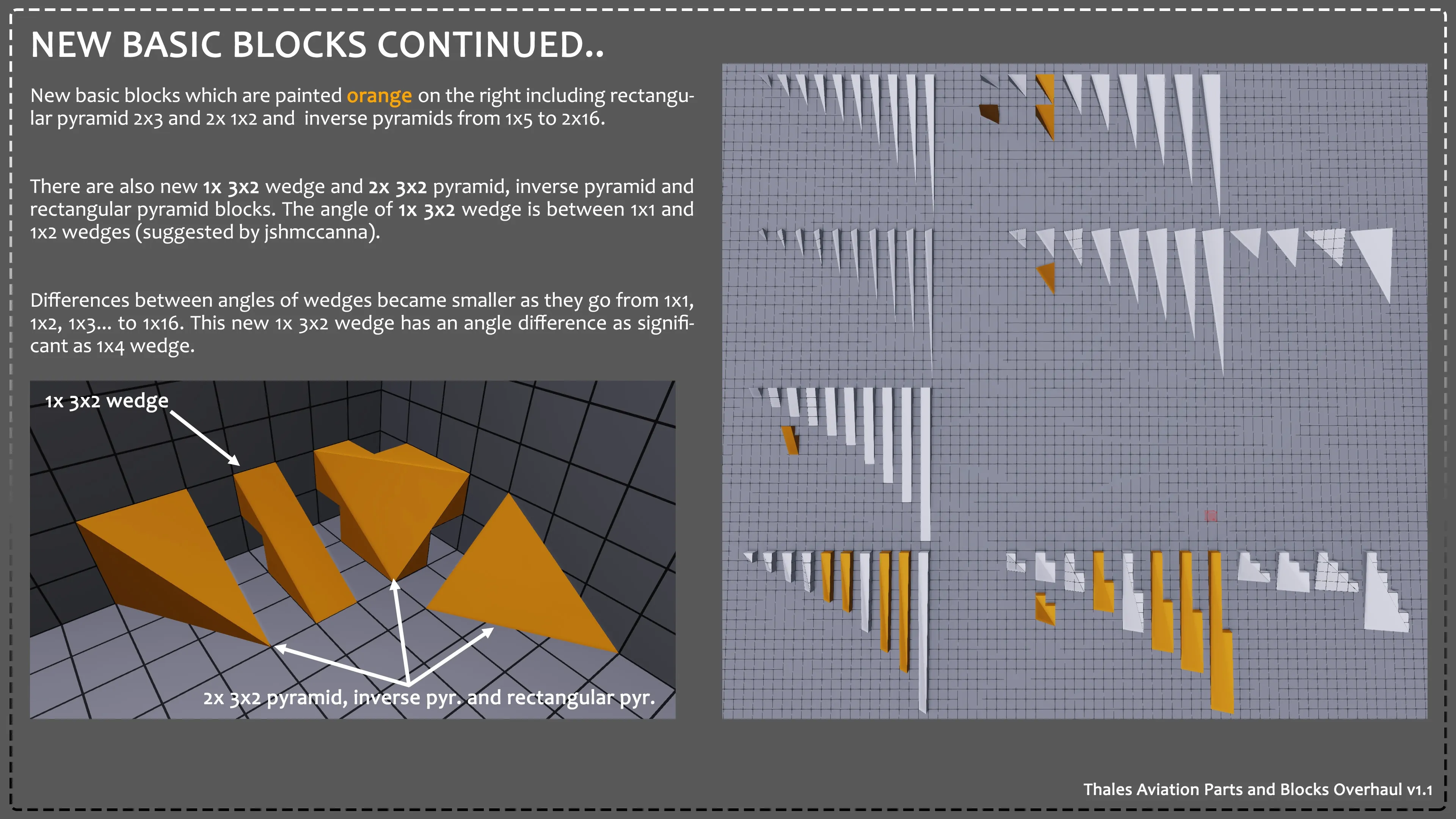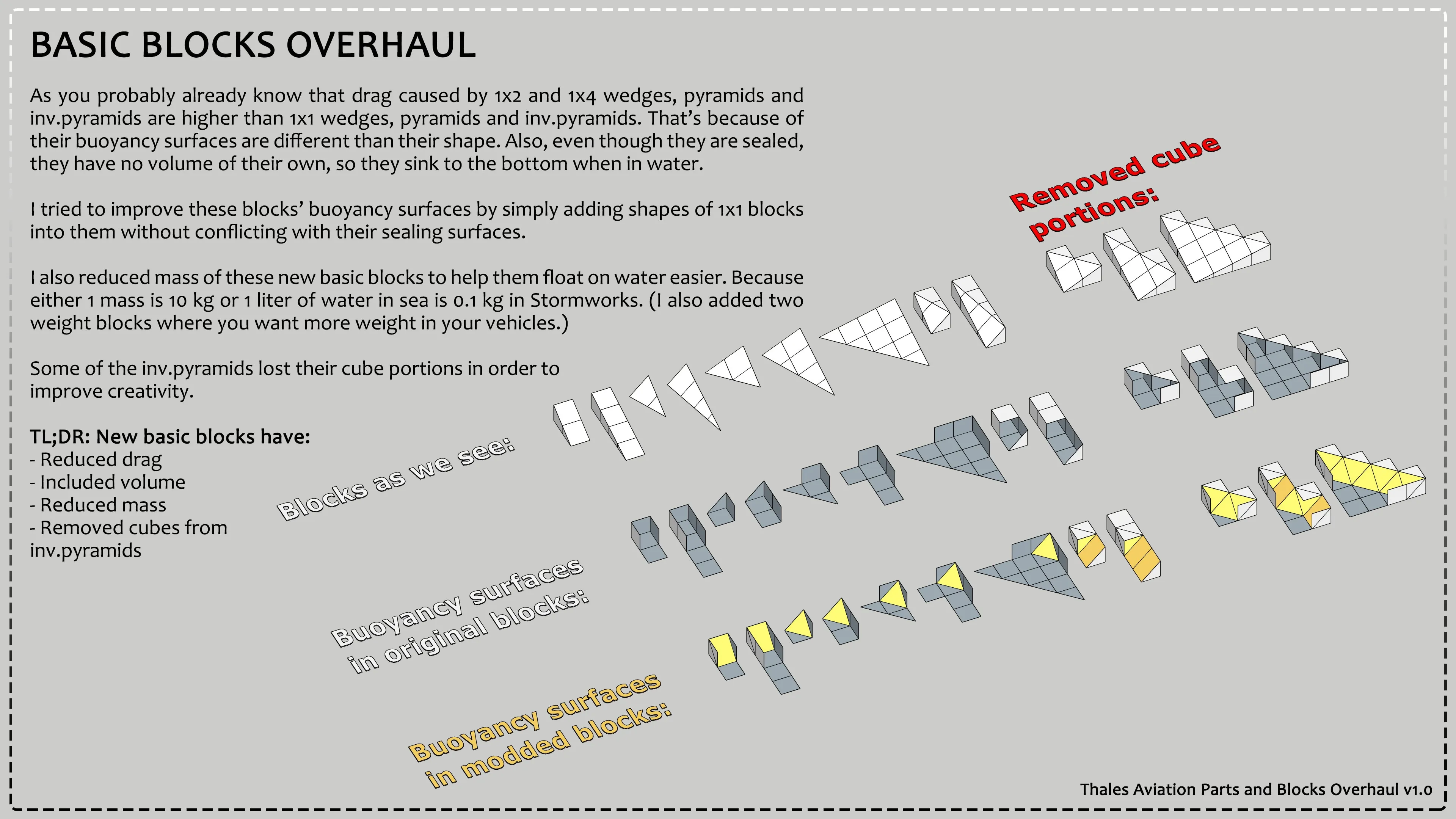 I have also done a few other things including fixing the "Half Block Offset (Power)" part and fixing all of the strangely placed spaces in between the wedges and pyramid's dimensions (1x 1 --> 1x1). I've also reduced the file size of each part again. They are now almost half the size of the original, but still function the same. The custom wheels are still unfixable right now, so they are not included, but everything else should be. Also, I am not adding anything extra to this mod, please stop asking.