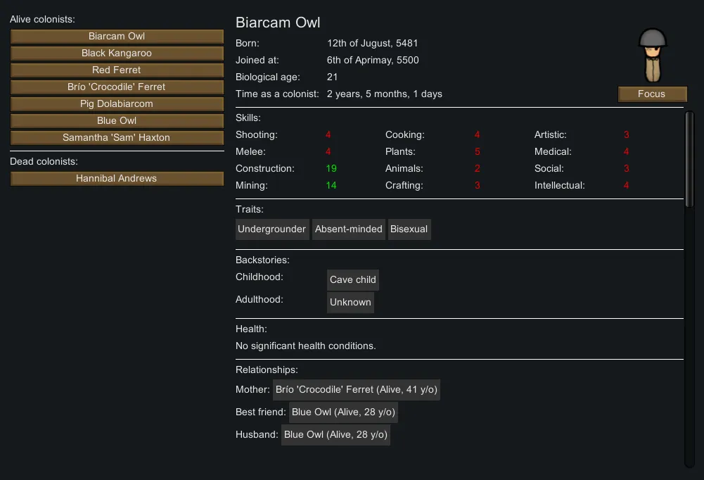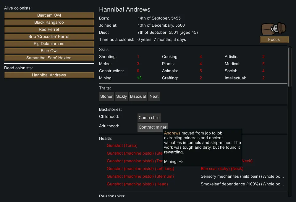 A simple statistics tab that provides information about both living and dead colonists. This window allows you to view key data, including: