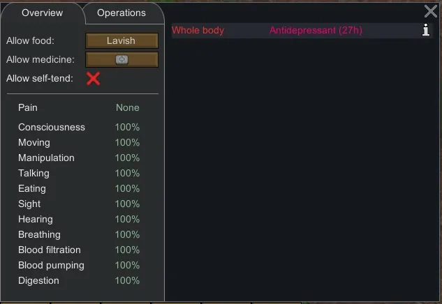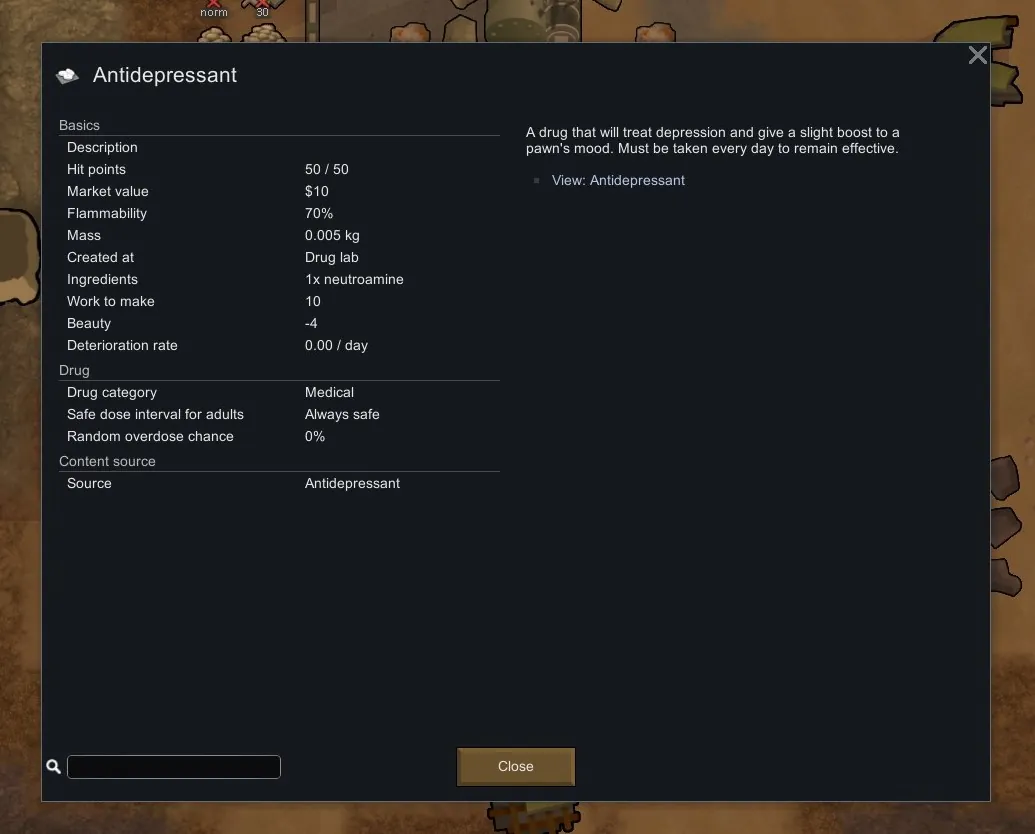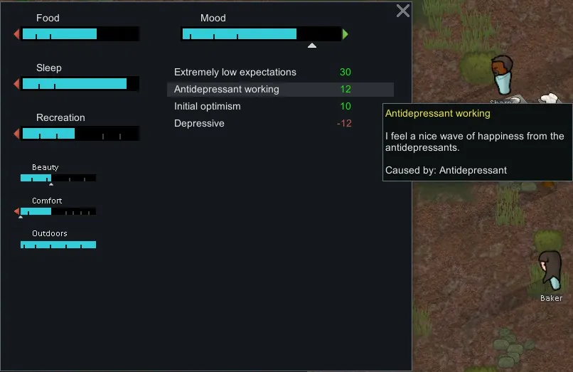 This mod adds an Antidepressant to the game, a drug that will give a mood boost to counter the mood debuff from a pawns depressive trait and is also able to give an overall boost to pawn mood if enabled in mod settings.