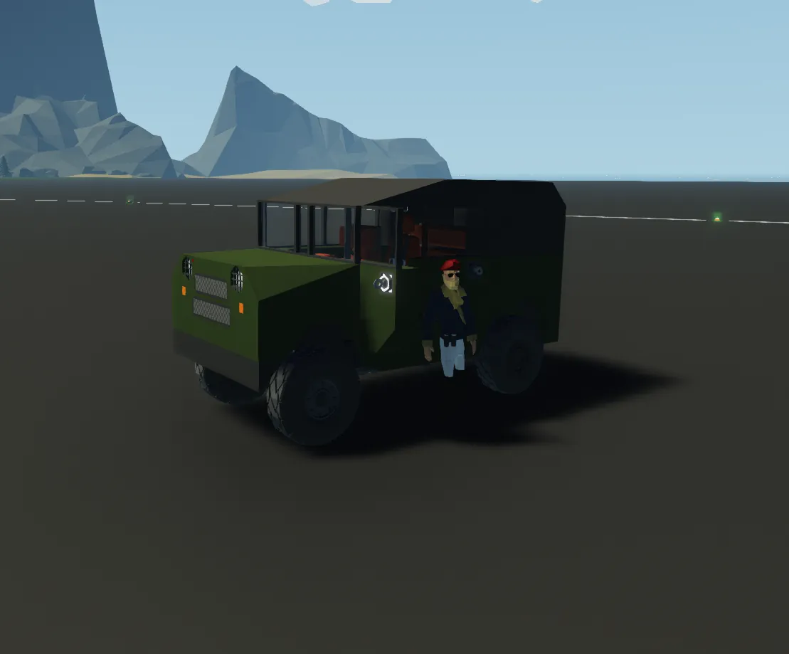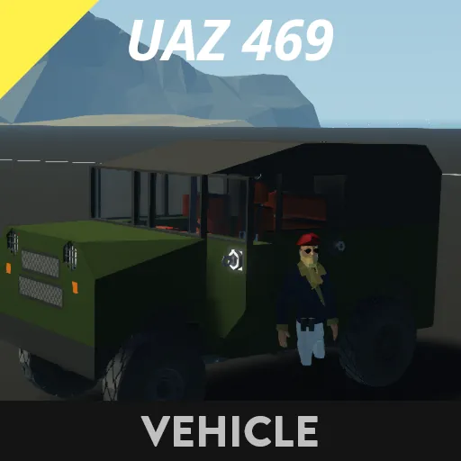 To turn on the engine switch the ignition key on your right as a driver. Release the parking brake on your left. By default the gearbox is in neutral gear - gear N. In order to switch gears use the up and down arrows. The gearbox has 1 reverse and 3 forward gears and reaches up to 120 in game KPH on the 3rd gear. Each dial or other type of display or button is described. Standard: RPM dial, speed dial, fuel gauge and a battery charge gauge. Two blinkers were added. Click on the button and the blinker will turn on and off for a brief amount of time. Two indicators inside the cabin indicate which blinker is on or off. The electric connector makes it possible to attach trailers to the UAZ. I plan on building at least 1 in the near future.
