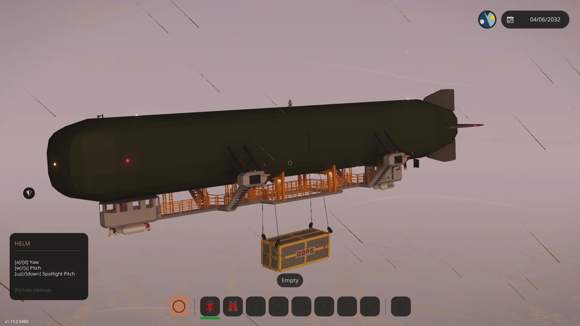 This Airship utilises an XML edited rocket motor to have negative fuel, resulting in an upward force from its negative mass. Gas tanks that compress air to act as ballast. There is enough ballast and lift to be able to carry a single container.