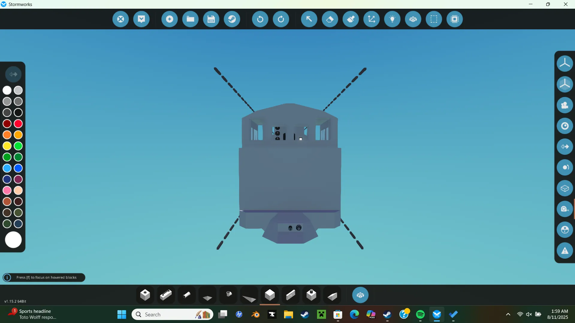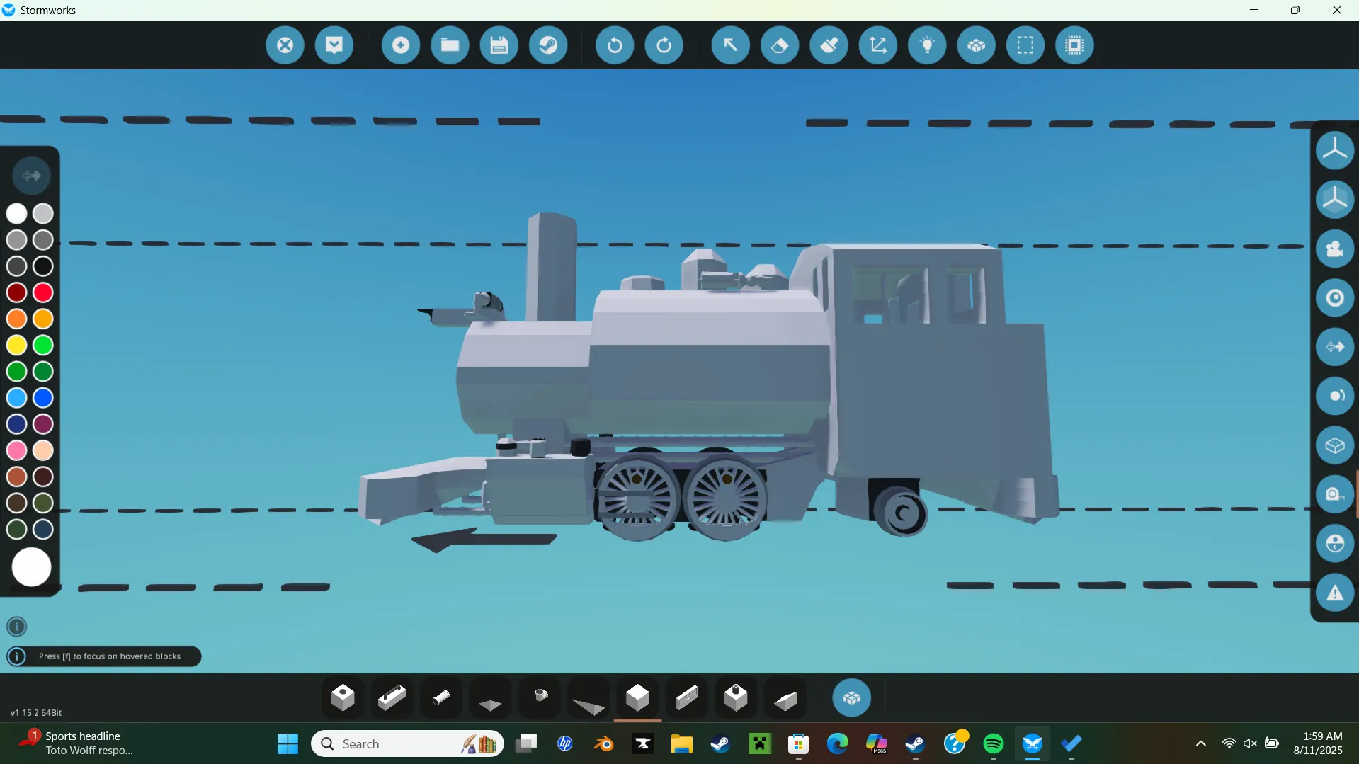 even though not standard i am so lazy i used a lot of standard parts of my existing locomotives. this includes the cab of my pacific, the boiler from my unreleased 0-4-0, and a chunk of the fame from something else. the locomotive uses the C4V's mini steam mod by C4V Engineering but due to you not being able to upload items using mods, you will need to install the boiler and condencer your self. i know the vanila system fits because my slightly smaller 0-4-0 uses it but i may take a bit to modify it to use the vanila system. anyways as as always feel free to modify and im open to requests.