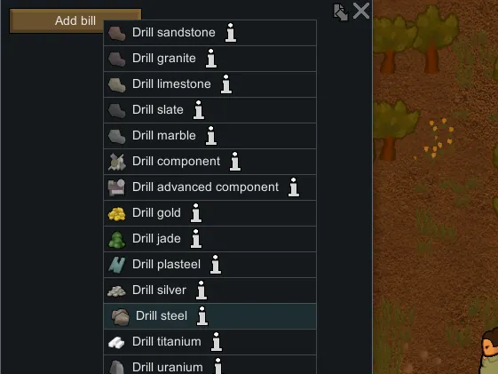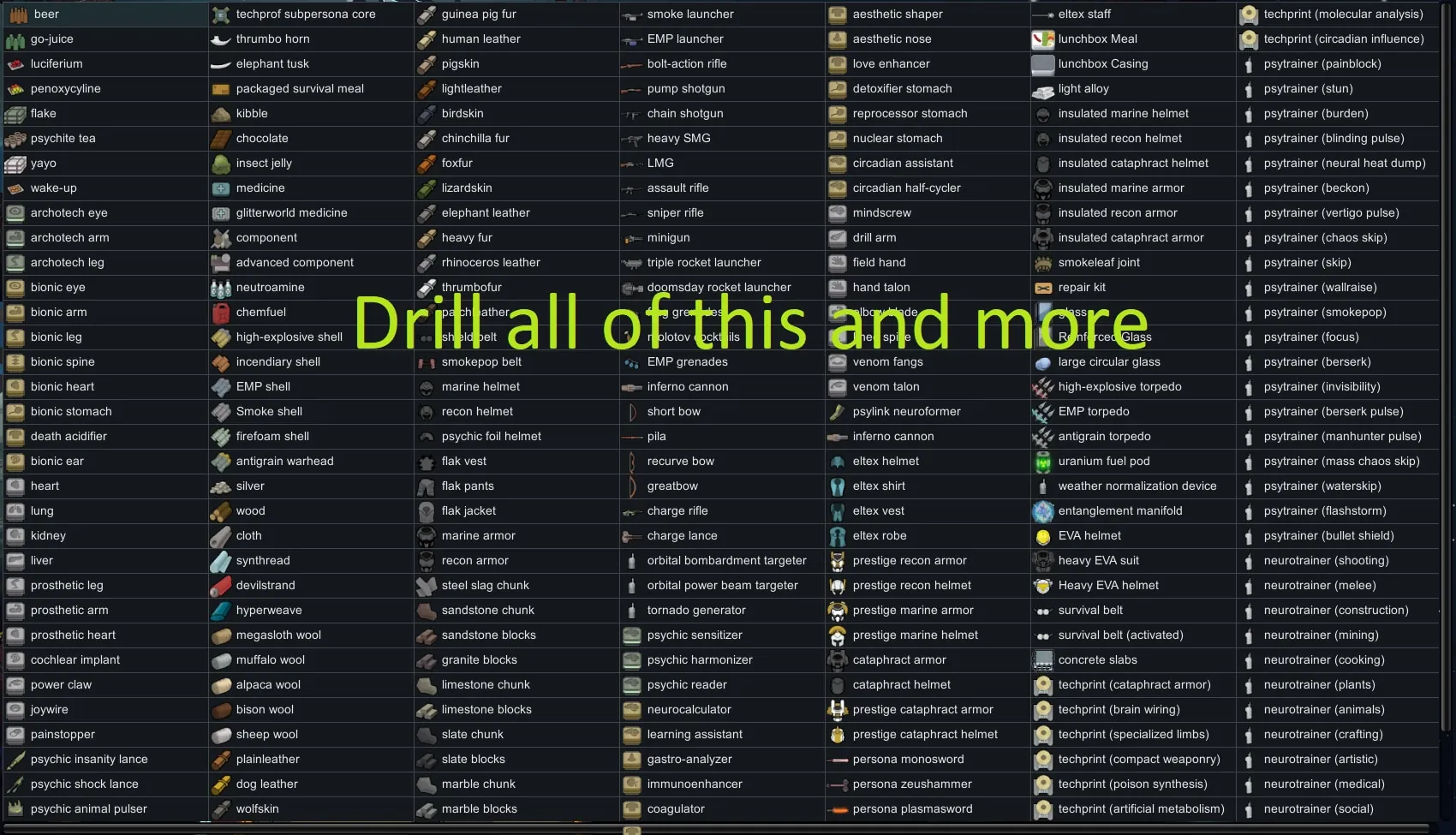 A: This drill can literally drill every item in existence. I filtered some unusable items out but mods and Rimworld updates might add new items that were never meant for direct use in the game. Fix: Just don't add those items through the mod menu.