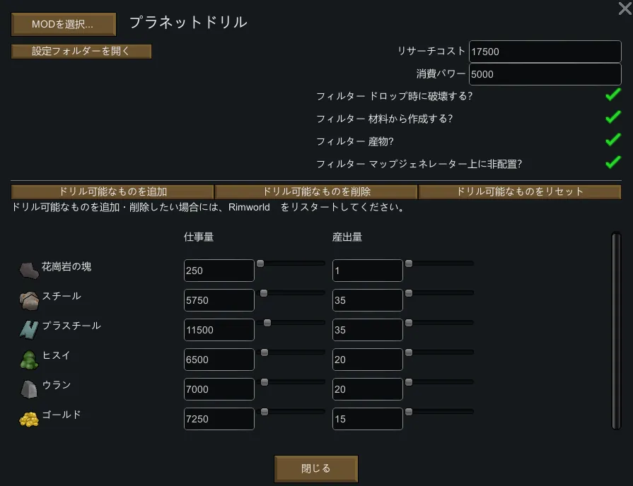 [*] Disabling some filters and adding items to drill that the Rimworld devs did not intend you to ever spawn, will of course raise errors but I gave you the ability to add them anyway.