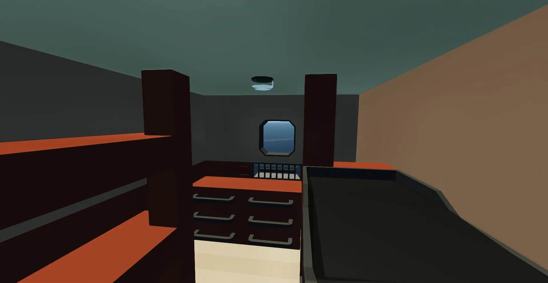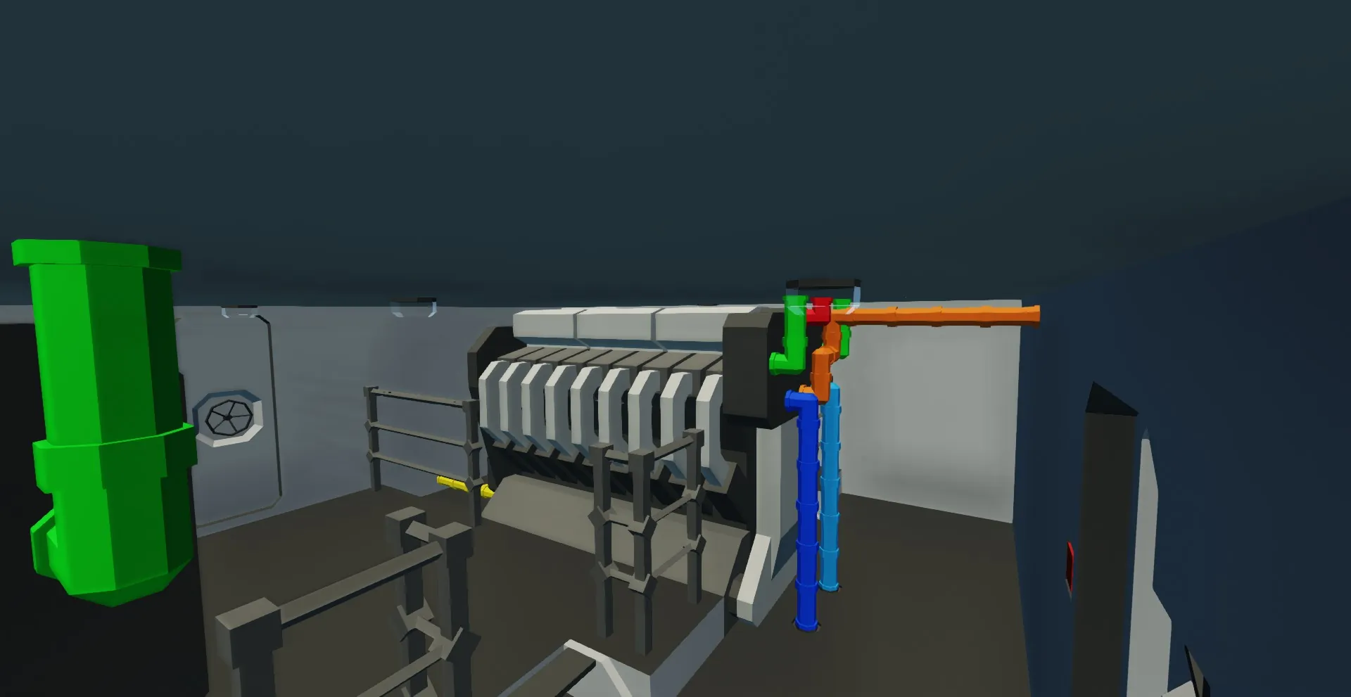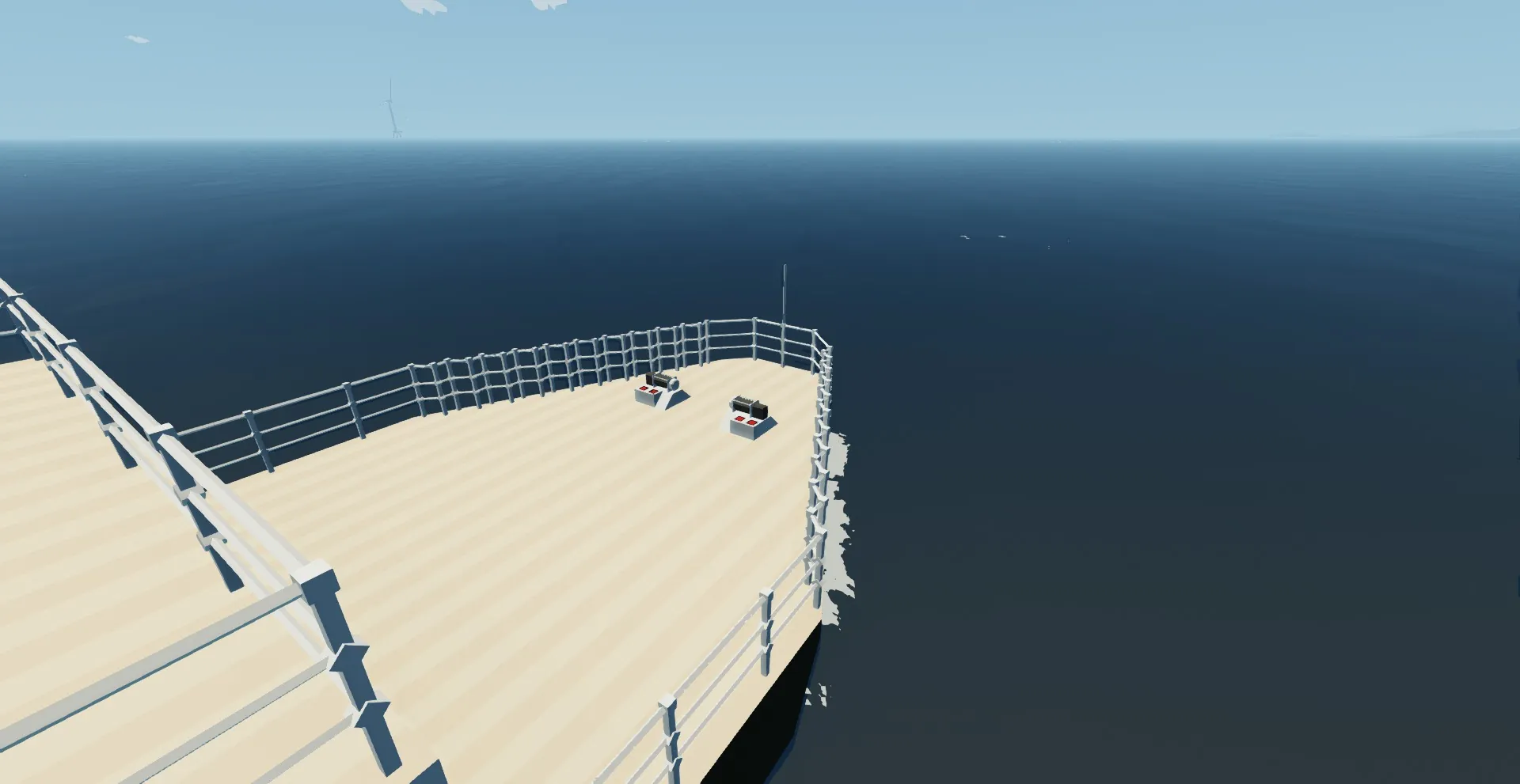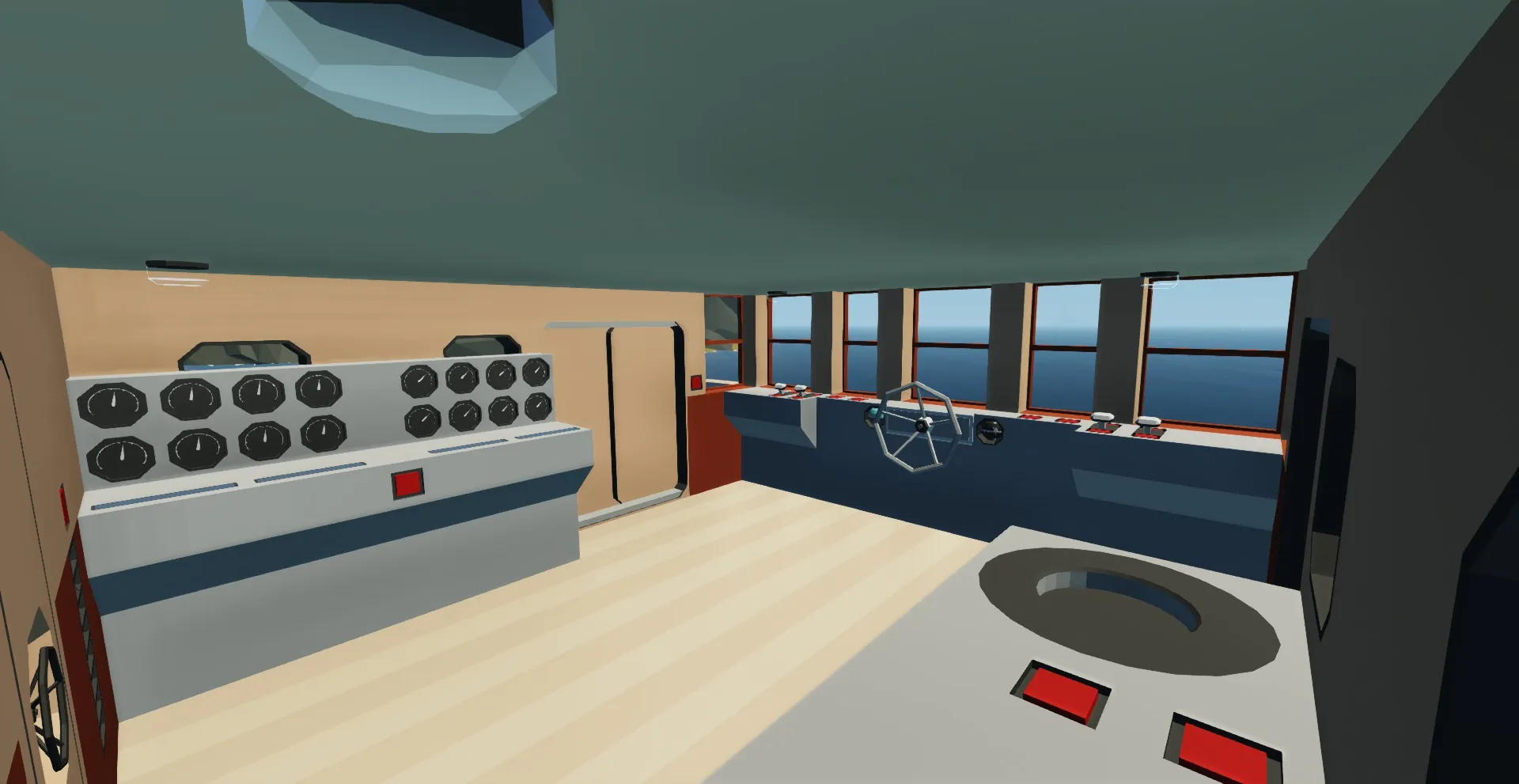 To start the ship head to the bridge and turn up the throttle lever (the 2 on the left are non functional). Then push the start engine button for about 1-2 seconds. You should hear the engines start up. Then to move forward turn up the clutch lever. Also on the bridge is a panel with displays that show the various information about the engines and fuel tank. Behind the bridge is a chartroom with a map and a radio room which contains the radio equipment and trasnponder.