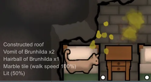Cats can also do something called "Targeted Vomit" where they can leave their zone and vomit on a target, just like in real life. Chance of this happening is adjustable in settings, set at zero to disable. Targets can be one of 3 groups, beds, chairs, or anything with CatTarget_ModExtension. External target support can be added to buildings with: