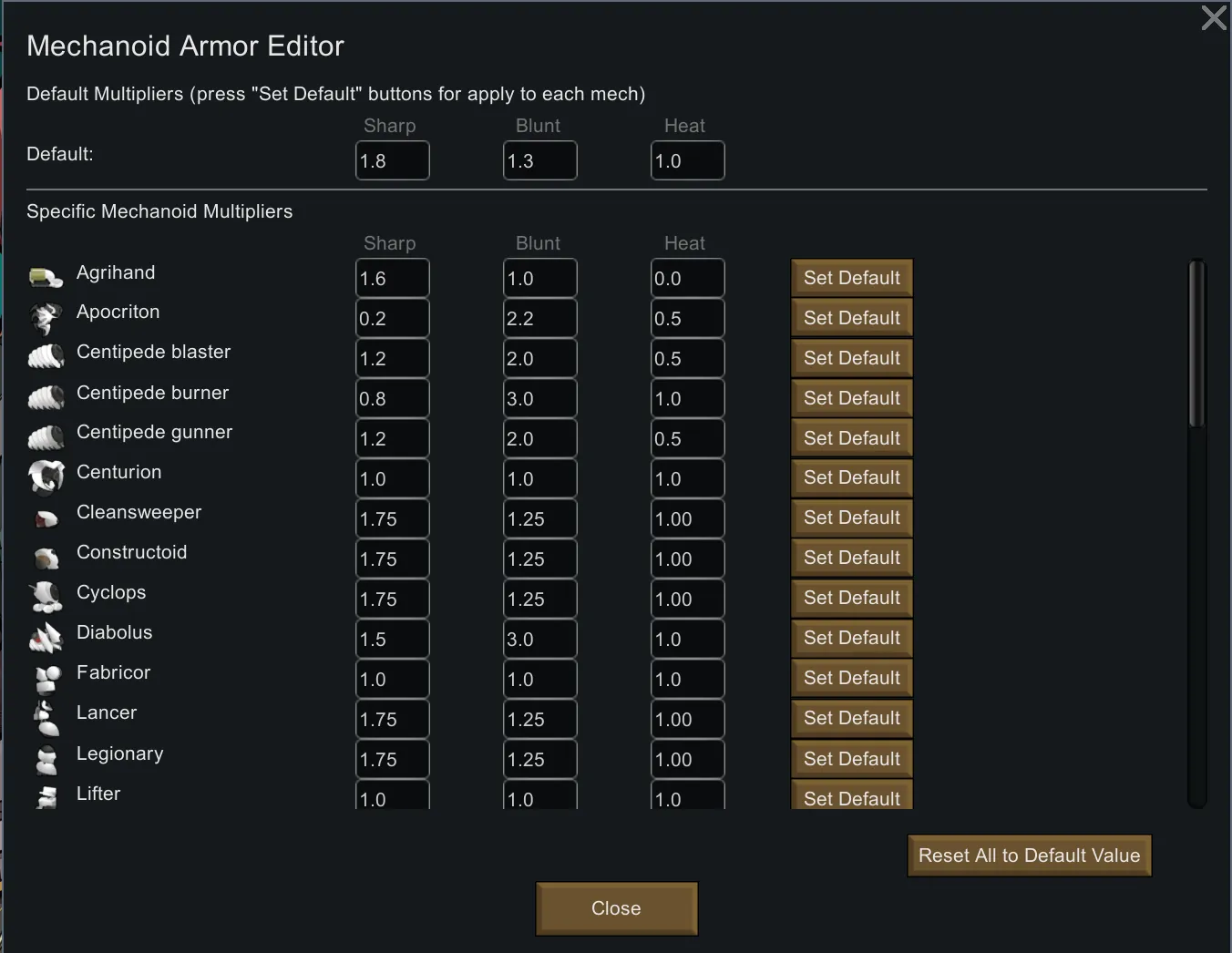[]You can individually adjust Sharp / Blunt / Heat defense for each mechanoid.[]Changes are applied immediately when settings are modified. No need to restart the game anymore.[]Applies commonly to both friendly and enemy mechanoids.[]Code only executes when loading settings, so it doesn't impact performance.