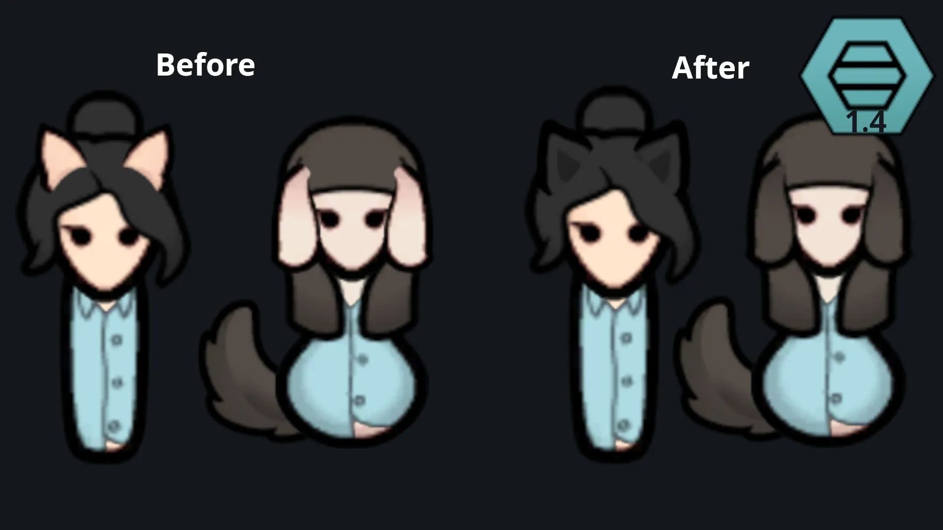 Replaces the Biotech Cat and Dog Ears with cuter ones and matches them to the hair color.