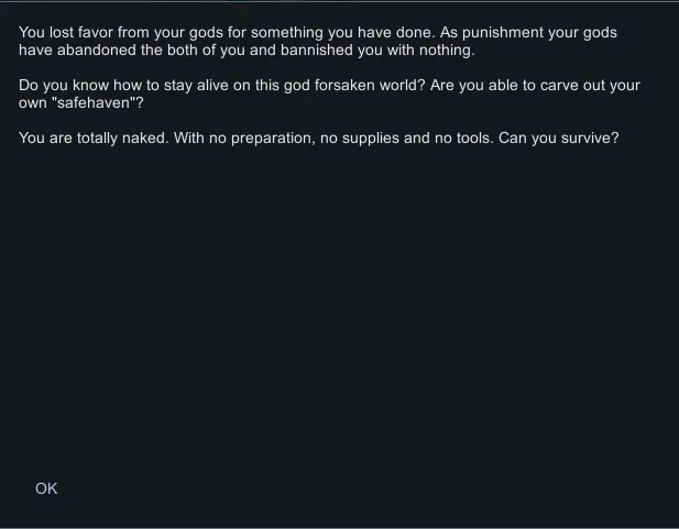 The idea for this scenario came from a [b]Banished[/b] mod that allowed you to start with 2 people. It was called [b]"Adam & Eve"[/b] and was absorbed into a compilation mod.