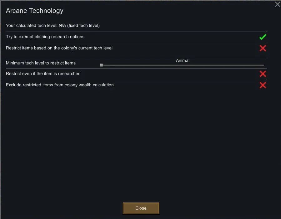 The recommended settings for 'Arcane Technology' are shown in preview pictures, but using the colony tech level allow to bypass the research requirements (tribal pawns could use revolver in industrial colony without 'Gunsmithing' researched...).