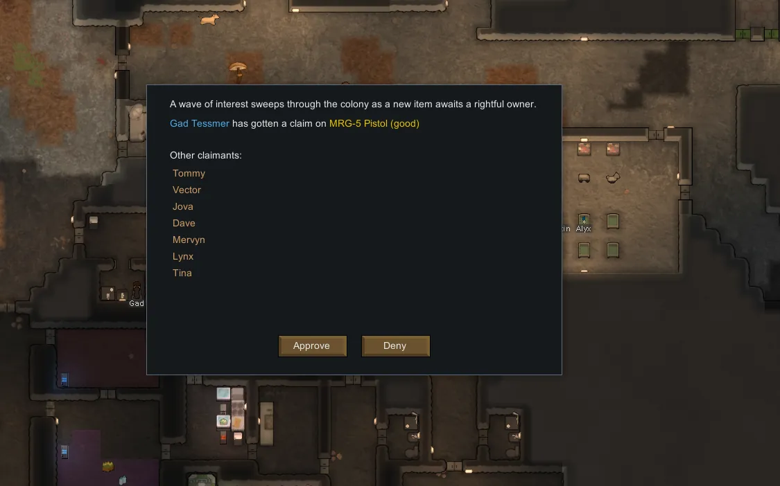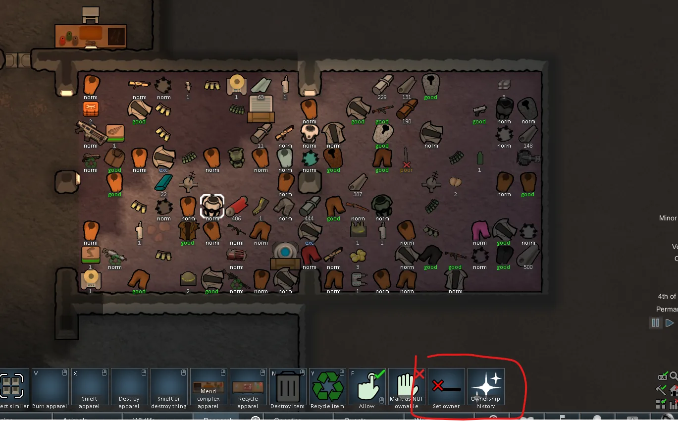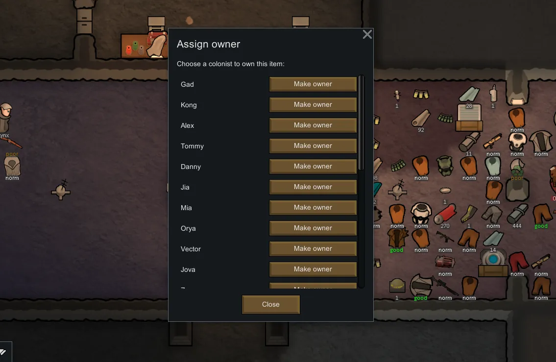 [*] [b]Item ownership[/b]: your pawns own their own stuff. Only them can use it, and they'll be happy from having their own stuff.