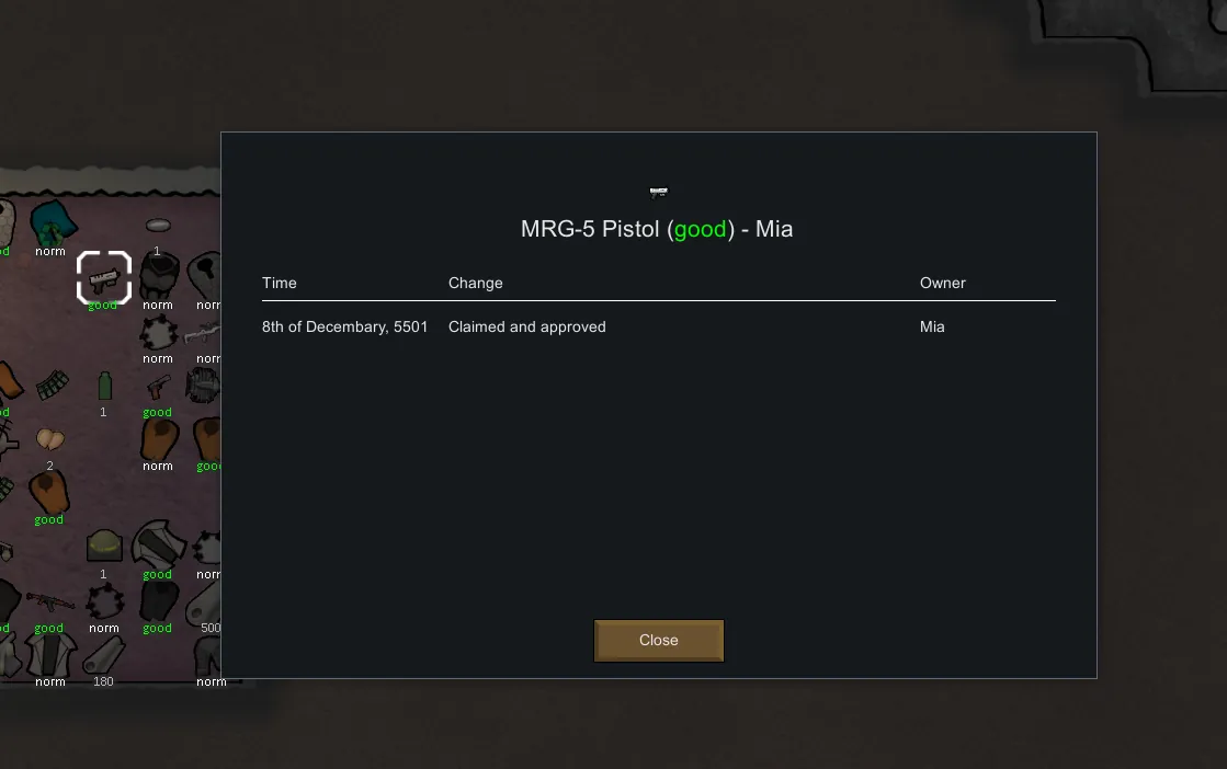 [*] [b]When is an item considered owned by the colony?[/b]: When it's in colony storage. Stockpile zone, shelf, container etc.