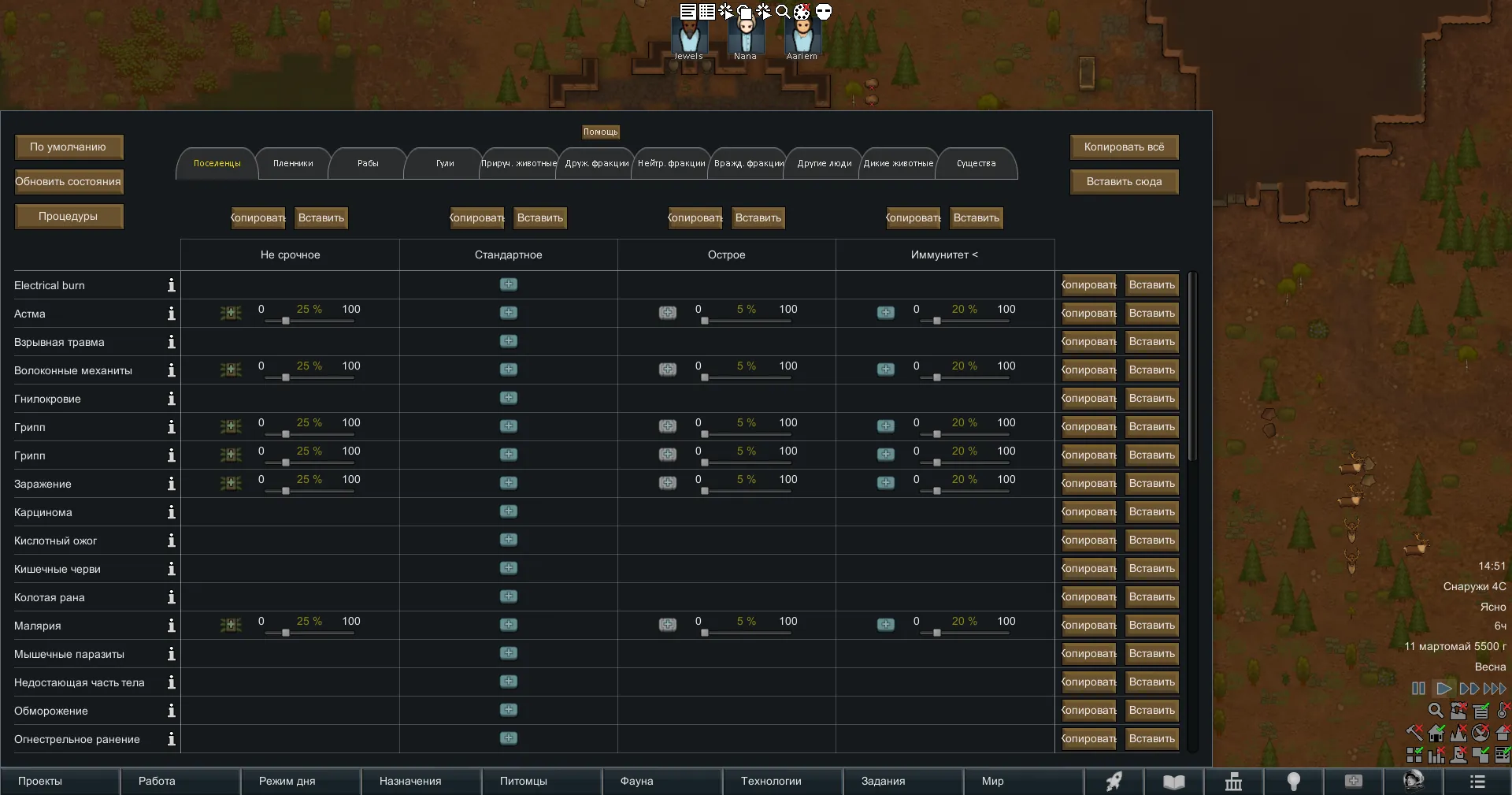 [*] Каждая категория пешек содержит все склонные к заболеванию состояния, но есть возможность скрыть те, которые, по вашему мнению, не должны быть в списке (например, грипп животных на вкладке поселенцев).