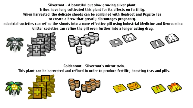 The mod introduces Silverroot and Goldenroot, these two plants can be farmed or can grow wild. These plants are the base for the drugs, drugs derived from Silverroot will reduce fertiltiy and drugs derived from Goldenroot will increase fertility.