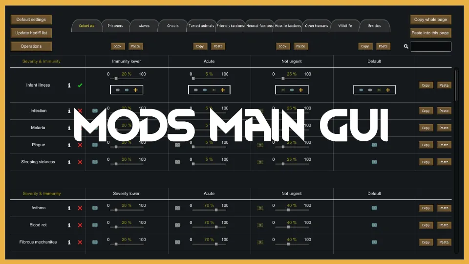 [*] [b]New main tab gui:[/b] You can set which medicine to use at different (customizable) stages for each tendable hediff/disease.
