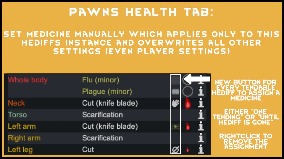 [*] [b]Assign medicine in a pawns health tab:[/b] You can assign medicine to every tendable hediff of a pawn ("once" or "until hediff is gone") which then applies only for that specific pawn and that specific instance of the hediff and does not consider the gui/player settings.